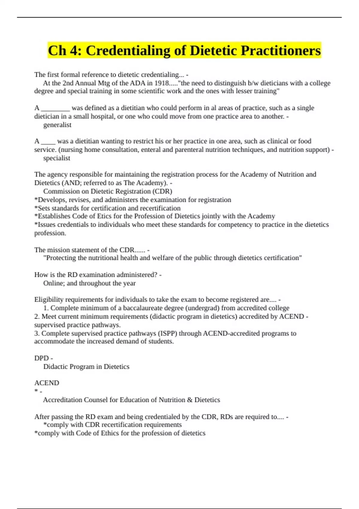 The first formal reference to dietetic credentialing... - At the 2nd Annual Mtg of the ADA in 1918....."the need to distinguish b/w dieticians with a college degree and special training in some scientific work and the ones with lesser training" A ________ was defined as a dietitian who could perform in al areas of practice, such as a single dietician in a small hospital, or one who could move from one practice area to another. - generalist A ____ was a dietitian wanting to restrict his or her practice in one area, such as clinical or food service. (nursing home consultation, enteral and parenteral nutrition techniques, and nutrition support) - specialist