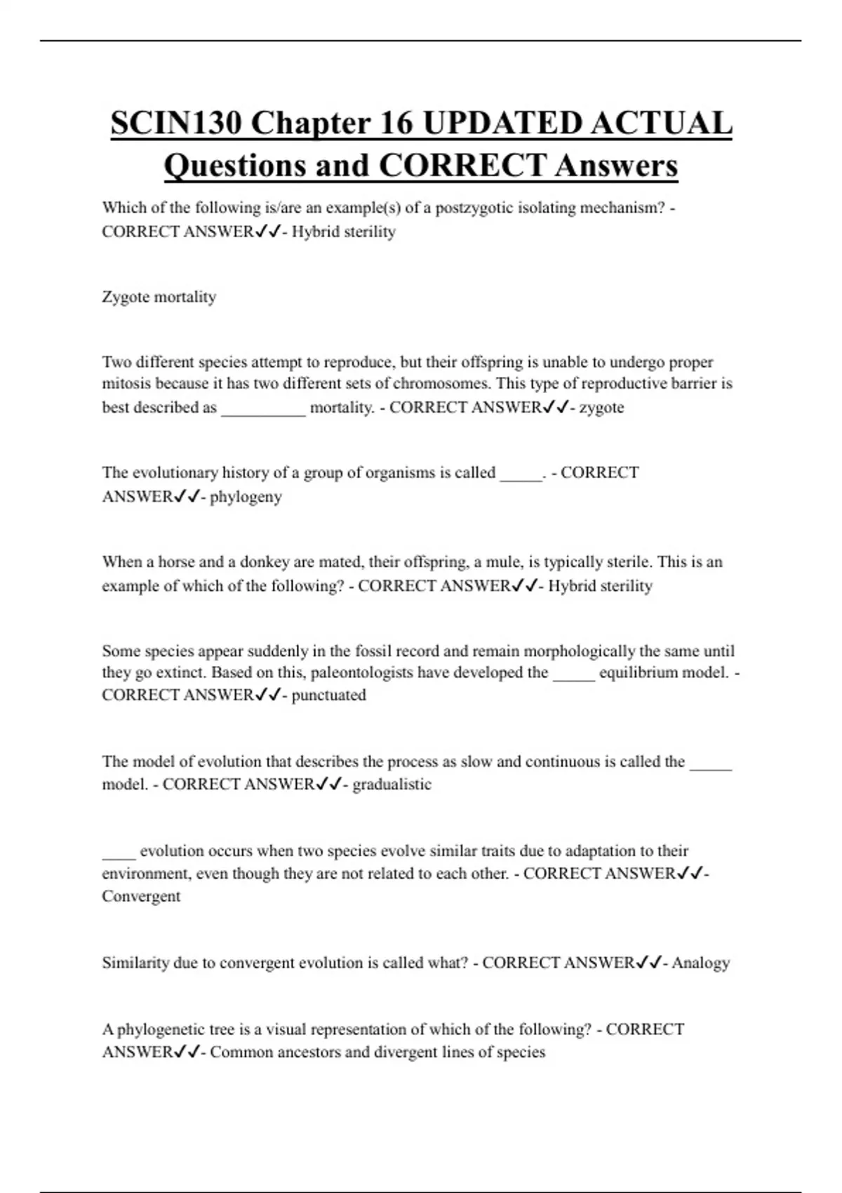 SCIN130 Chapter 16 UPDATED ACTUAL Questions and CORRECT Answers Which of the following is/are an example(s) of a postzygotic isolating mechanism? - CORRECT ANSWER- Hybrid sterility Zygote mortality Two different species attempt to reproduce, but their offspring is unable to undergo proper mitosis because it has two different sets of chromosomes. This type of reproductive barrier is best described as __________ mortality. - CORRECT ANSWER- zygote