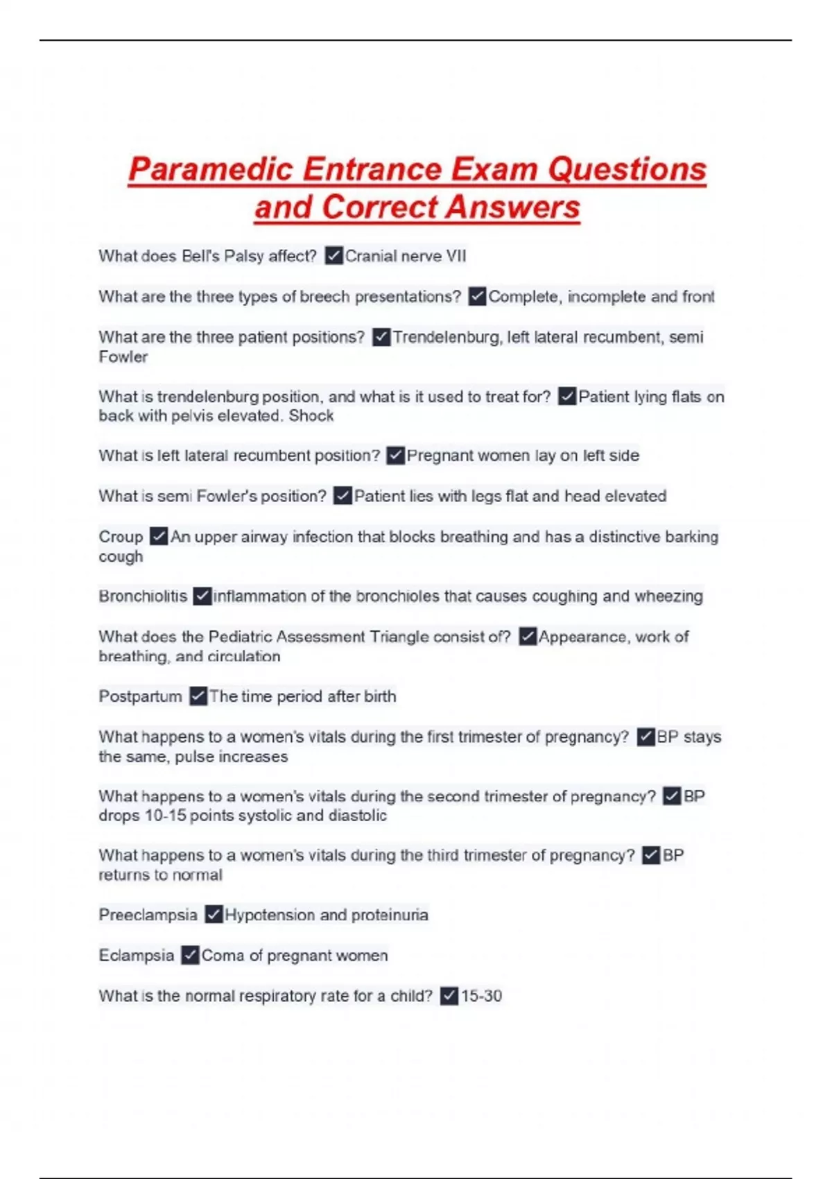 Paramedic Entrance Exam Questions and Correct Answers