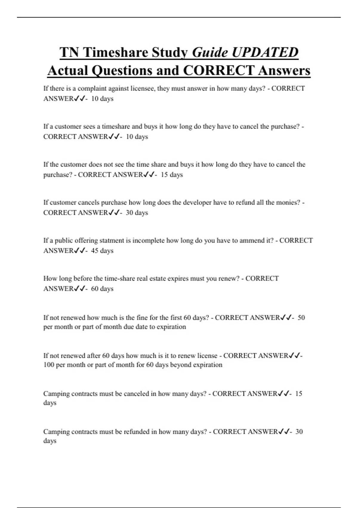 TN Timeshare Study Guide UPDATED Actual Questions and CORRECT Answers If there is a complaint against licensee, they must answer in how many days? - CORRECT ANSWER- 10 days If a customer sees a timeshare and buys it how long do they have to cancel the purchase? - CORRECT ANSWER- 10 days If the customer does not see the time share and buys it how long do they have to cancel the purchase? - CORRECT ANSWER- 15 days