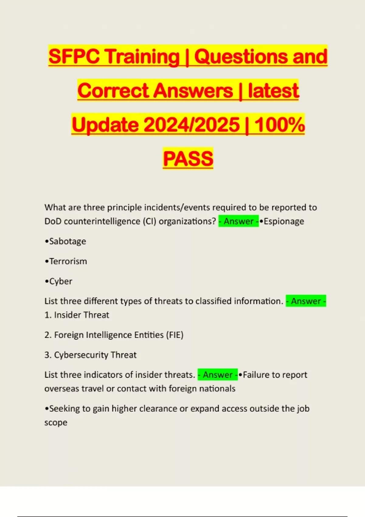 SFPC Training | Questions and Correct Answers | latest Update 2024/2025 | 100% PASS What are three principle incidents/events required to be reported to DoD counterintelligence (CI) organizations? - Answer -•Espionage •Sabotage •Terrorism •Cyber List three different types of threats to classified information. - Answer - 1. Insider Threat