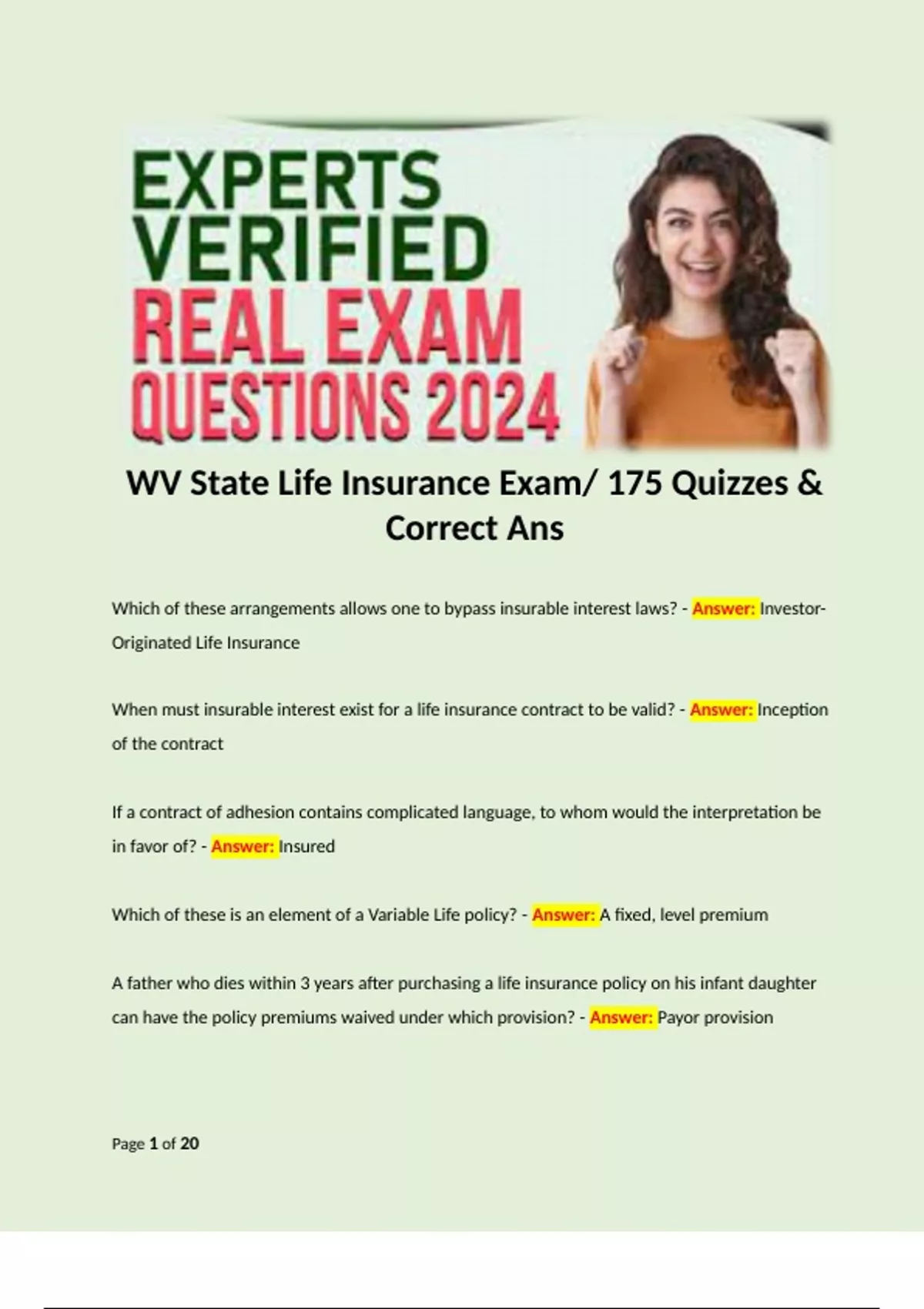 WV State Life Insurance Exam/ 175 Quizzes & Correct Ans. Terms like: Which of these arrangements allows one to bypass insurable interest laws? - Answer: Investor-Originated Life Insurance When must insurable interest exist for a life insurance contract to be valid? - Answer: Inception of the contract If a contract of adhesion contains complicated language, to whom would the interpretation be in favor of? - Answer: Insured