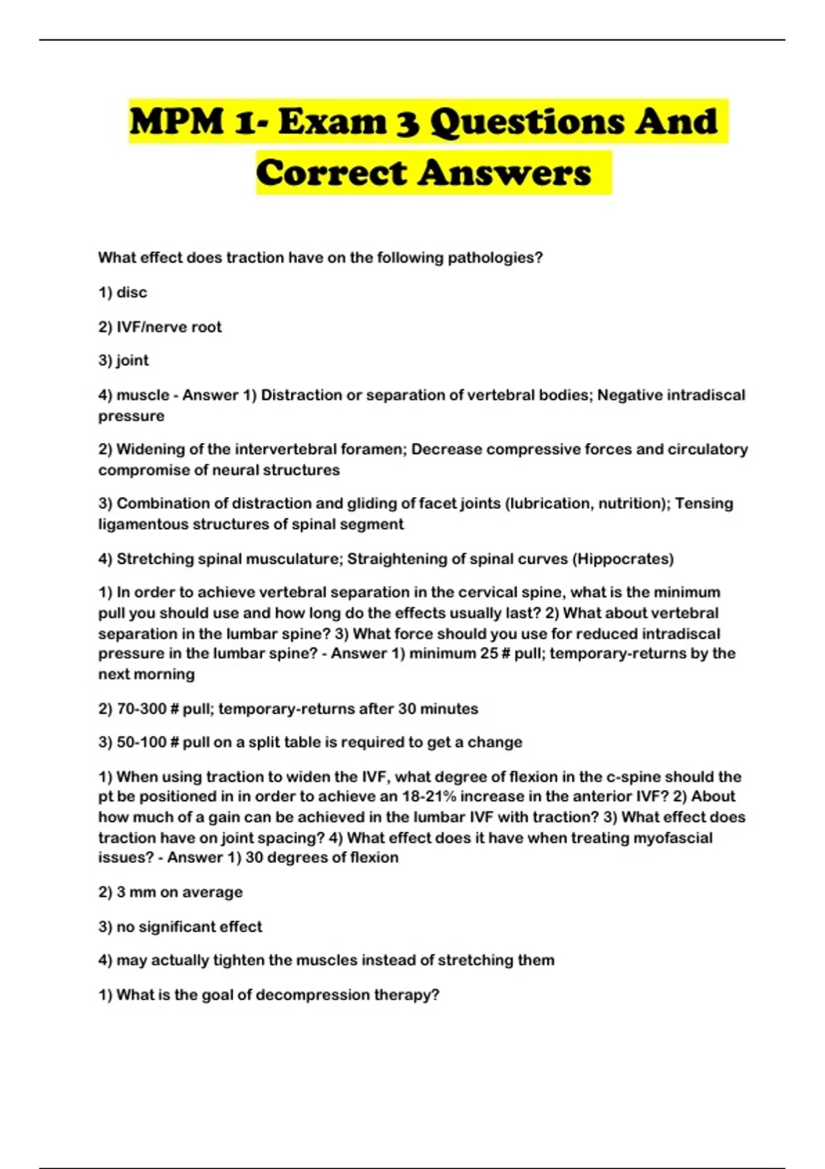 pressure in the lumbar spine? - Answer 1) minimum 25 # pull; temporary-returns by the