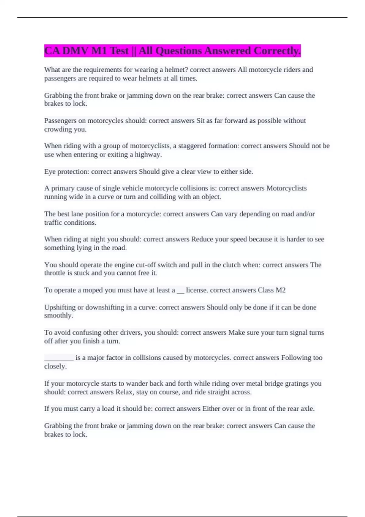 What are the requirements for wearing a helmet? correct answers All motorcycle riders and passengers are required to wear helmets at all times. Grabbing the front brake or jamming down on the rear brake: correct answers Can cause the brakes to lock. Passengers on motorcycles should: correct answers Sit as far forward as possible without crowding you. When riding with a group of motorcyclists, a staggered formation: correct answers Should not be use when entering or exiting a highway. Eye protection: correct answers Should give a clear view to either side. A primary cause of single vehicle motorcycle collisions is: correct answers Motorcyclists running wide in a curve or turn and colliding with an object. The best lane position for a motorcycle: correct answers Can vary depending on road and/or traffic conditions. When riding at night you should: correct answers Reduce your speed because it is harder to see something lying in the road. You should operate the engine cut-off switch and pull in the clutch when: correct answers The throttle is stuck and you cannot free it. To operate a moped you must have at least a __ license. correct answers Class M2 Upshifting or downshifting in a curve: correct answers Should only be done if it can be done smoothly. To avoid confusing other drivers, you should: correct answers Make sure your turn signal turns off after you finish a turn. ________ is a major factor in collisions caused by motorcycles. correct answers Following too closely. If your motorcycle starts to wander back and forth while riding over metal bridge gratings you should: correct answers Relax, stay on course, and ride straight across. If you must carry a load it should be: correct answers Either over or in front of the rear axle. Grabbing the front brake or jamming down on the rear brake: correct answers Can cause the brakes to lock.