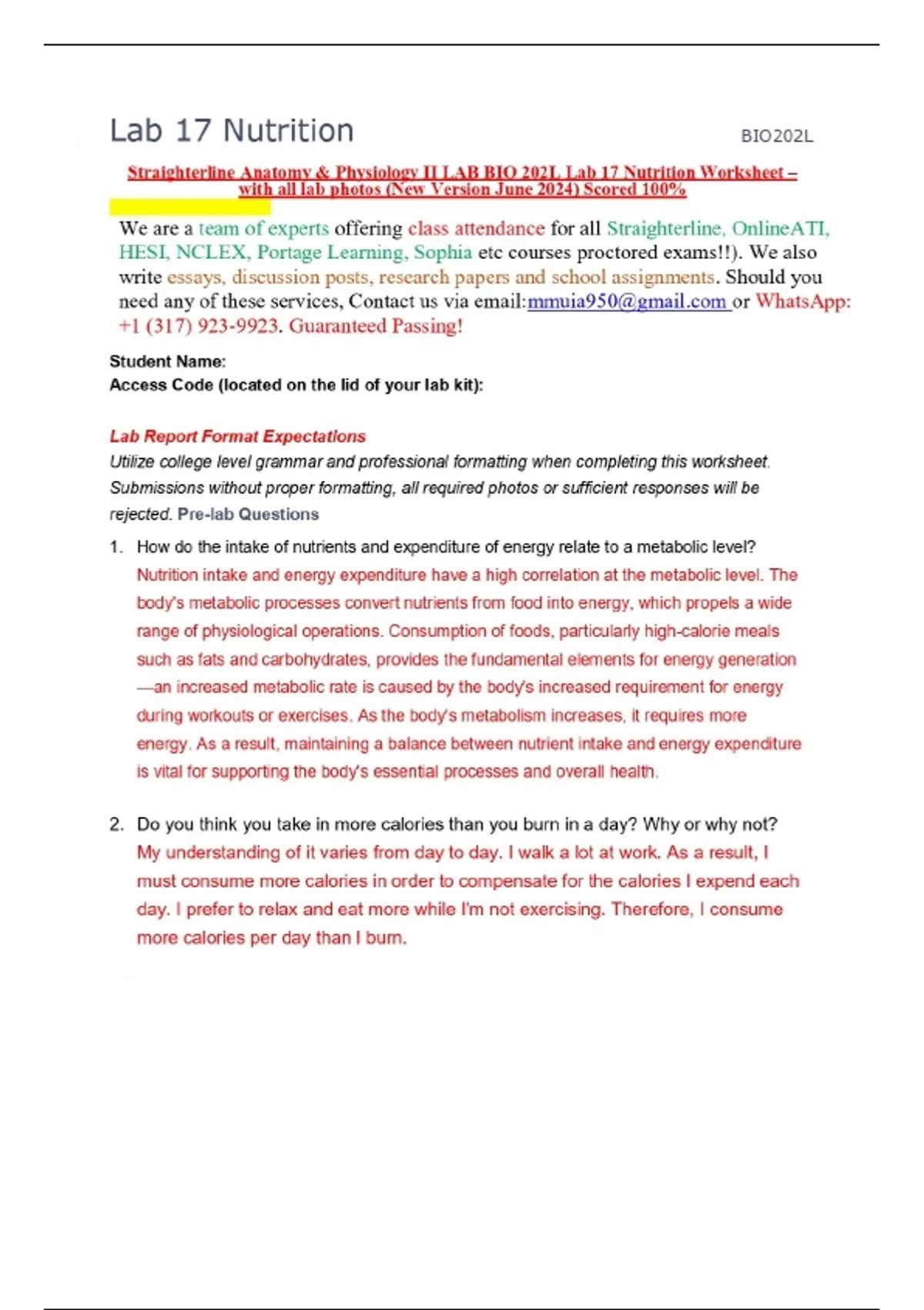 Lab 17 Nutrition BIO202L Straighterline Anatomy & Physiology II LAB BIO 202L Lab 17 Nutrition Worksheet – with all lab photos (New Version June 2024) Scored 100%