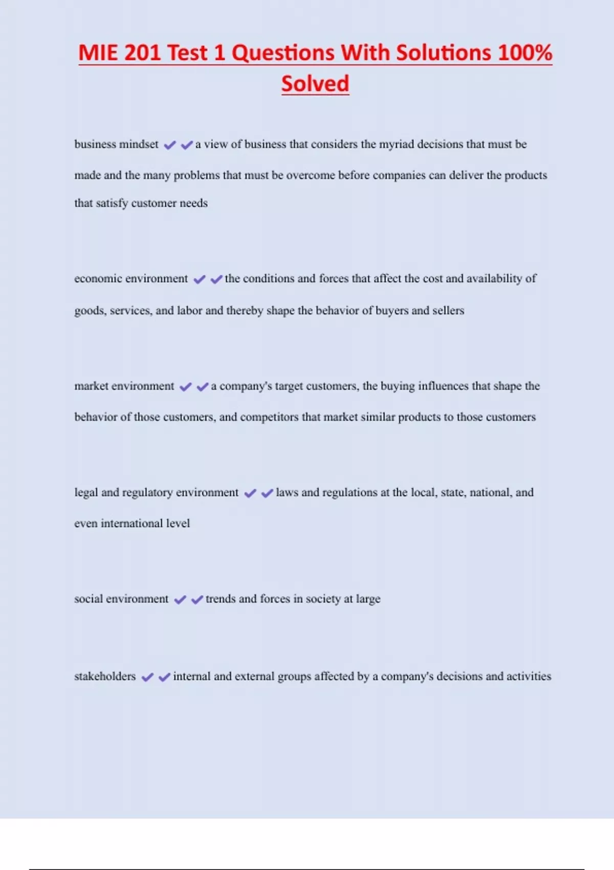 MIE 201 Test 1 Questions With Solutions 100% Solved business mindset a view of business that considers the myriad decisions that must be made and the many problems that must be overcome before companies can deliver the products that satisfy customer needs economic environment the conditions and forces that affect the cost and availability of goods, services, and labor and thereby shape the behavior of buyers and sellers market environment a company's target customers, the buying influences that shape the behavior of those customers, and competitors that market similar products to those customers legal and regulatory environment laws and regulations at the local, state, national, and even international level social environment trends and forces in society at large