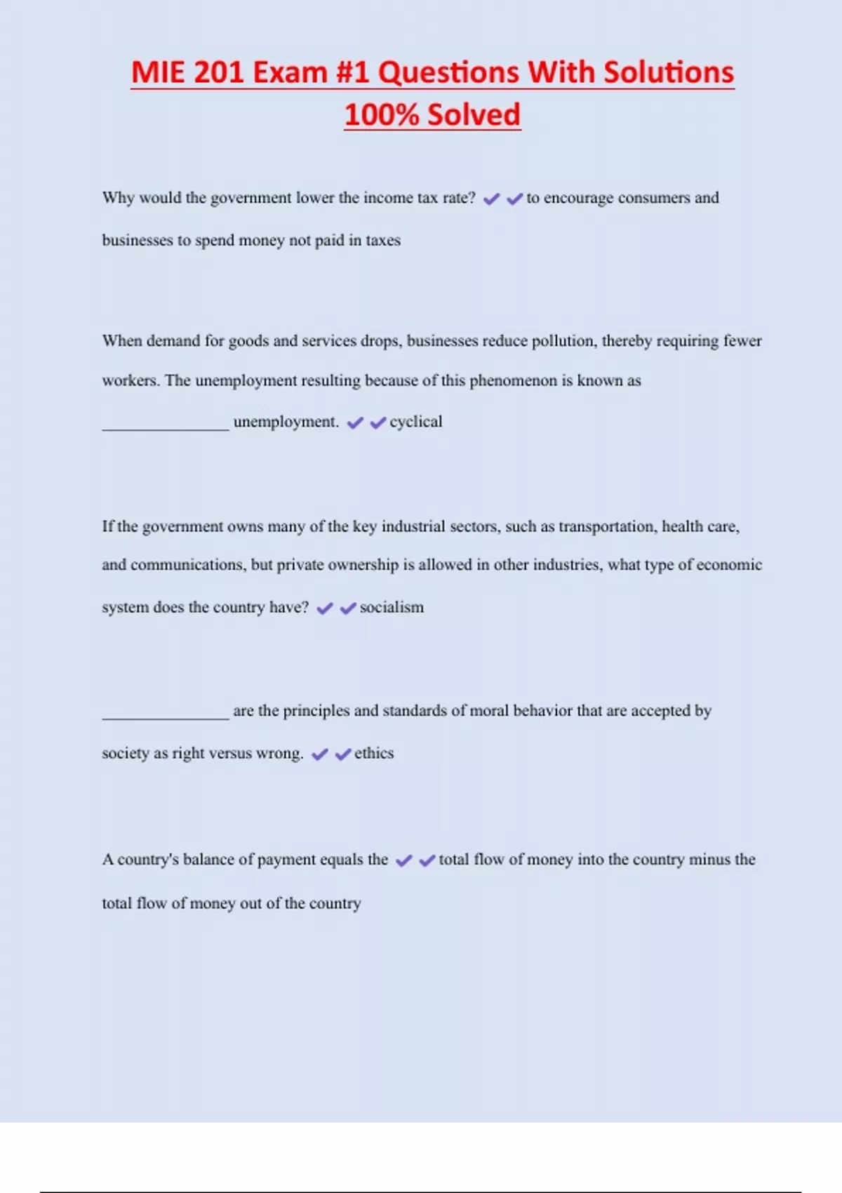 MIE 201 Exam #1 Questions With Solutions 100% Solved Why would the government lower the income tax rate? to encourage consumers and businesses to spend money not paid in taxes When demand for goods and services drops, businesses reduce pollution, thereby requiring fewer workers. The unemployment resulting because of this phenomenon is known as _______________ unemployment. cyclical If the government owns many of the key industrial sectors, such as transportation, health care, and communications, but private ownership is allowed in other industries, what type of economic system does the country have? socialism