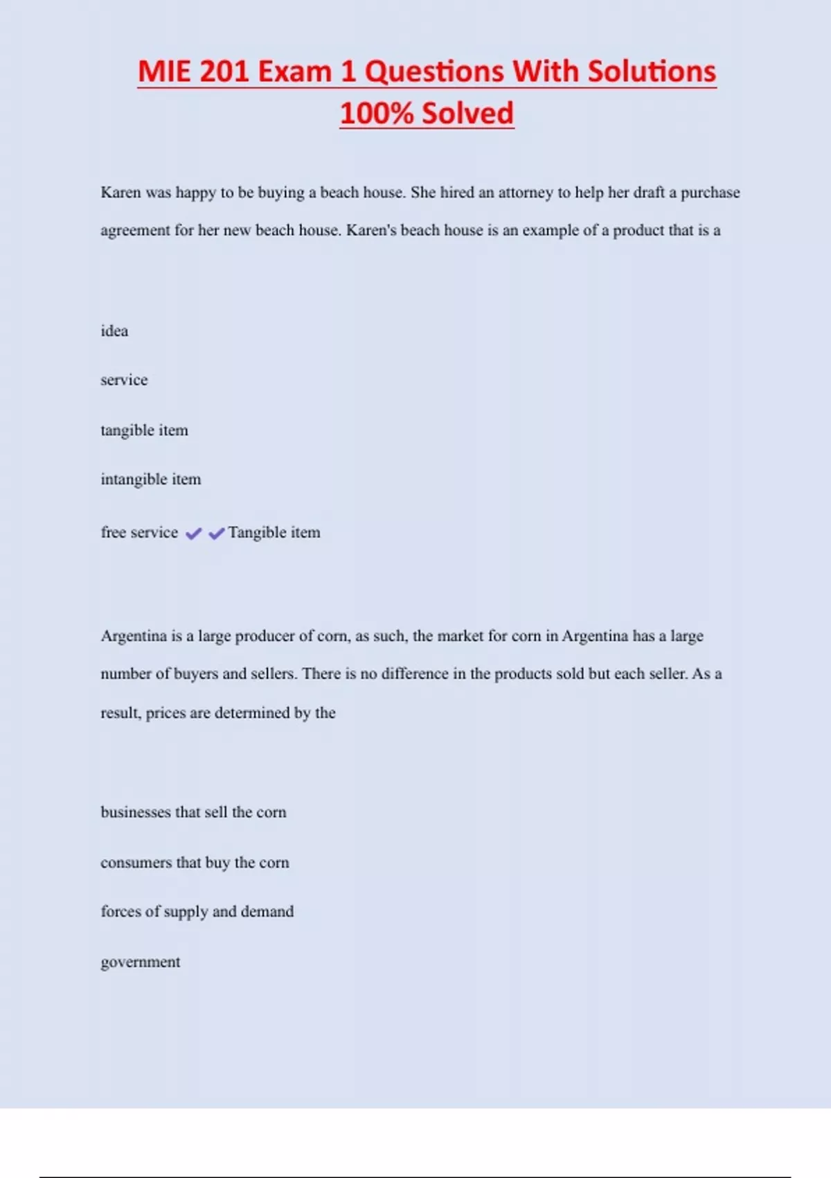 MIE 201 Exam 1 Questions With Solutions 100% Solved Karen was happy to be buying a beach house. She hired an attorney to help her draft a purchase agreement for her new beach house. Karen's beach house is an example of a product that is a idea service tangible item intangible item free service Tangible item