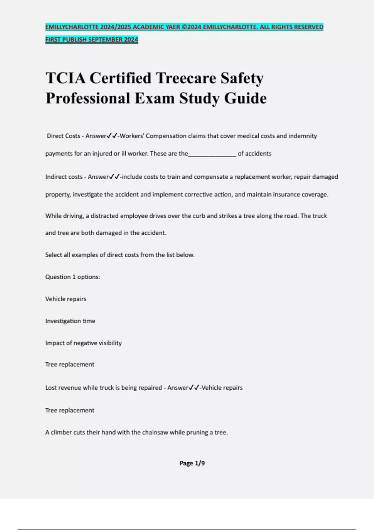 TCIA Certified Treecare Safety Professional Exam Study Guide Direct Costs - Answer-Workers' Compensation claims that cover medical costs and indemnity payments for an injured or ill worker. These are the______________ of accidents Indirect costs - Answer-include costs to train and compensate a replacement worker, repair damaged property, investigate the accident and implement corrective action, and maintain insurance coverage. While driving, a distracted employee drives over the curb and strikes a tree along the road. The truck and tree are both damaged in the accident. Select all examples of direct costs from the list below. Question 1 options: Vehicle repairs Investigation time Impact of negative visibility Tree replacement Lost revenue while truck is being repaired - Answer-Vehicle repairs Tree replacement A climber cuts their hand with the chainsaw while pruning a tree. EMILLYCHARLOTTE 2024/2025 ACADEMIC YAER ©2024 EMILLYCHARLOTTE. ALL RIGHTS RESERVED FIRST PUBLISH SEPTEMBER 2024 Page 2/9 Select all examples of indirect costs from the list below. Question 2 options: Workers' compensation increase Disability compensation Loss of productivity Loss of time from workers assisting the injured person Incident investigation Pharmacy Hospital and other medical expenses Loss of client - Answer-Loss of productivity Loss of time from workers assisting the injured person Incident investigation Loss of client A team member contacted a low overhead bridge when hauling a piece of equipment, resulting in the machine being totaled out. Select all direct costs associated with this accident. Question 3 options: Machine price EMILLYCHARLOTTE 2024/2025 ACADEMIC YAER ©2024 EMILLYCHARLOTTE. ALL RIGHTS RESERVED FIRST PUBLISH SEPTEMBER 2024 Page 3/9 Accident investigation Drug testing Time-off for worker - Answer-Machine price An employee cuts their hand on a pole saw while cutting a branch, resulting in five stitches. Which of the following are indirect costs associated with this accident? Question 4 options: Emergency room visit Follow-up doctor visit Incident investigation Lost production due to work stoppage Medication - Answer-Incident investigation Lost production due to work stoppage List two strategies that your company uses right now to increase employee involvement in safety activities (if this doesn't apply, say so). Are these strategies effective?