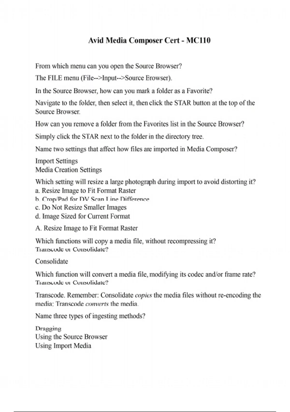 From which menu can you open the Source Browser? The FILE menu (File--Input--Source Browser). In the Source Browser, how can you mark a folder as a Favorite? Navigate to the folder, then select it, then click the STAR button at the top of the Source Browser. How can you remove a folder from the Favorites list in the Source Browser? Simply click the STAR next to the folder in the directory tree. Name two settings that affect how files are imported in Media Composer? Import Settings Media Creation Settings Which setting will resize a large photograph during import to avoid distorting it? a. Resize Image to Fit Format Raster b. Crop/Pad for DV Scan Line Difference c. Do Not Resize Smaller Images d. Image Sized for Current Format A. Resize Image to Fit Format Raster Which functions will copy a media file, without recompressing it? Transcode or Consolidate? Consolidate Which function will convert a media file, modifying its codec and/or frame rate? Transcode or Consolidate? Transcode. Remember: Consolidate copies the media files without re-encoding the media; Transcode converts the media. Name three types of ingesting methods? Dragging Using the Source Browser Using Import Media Name three reasons you might want to consolidate or transcode camera native media to Avid native media. 1. Faster and better performance for editing and playback 2. For Special Effects 3. For better file tracking and management which allows the user greater control of media files What is indicated by the bold name on one of your drives listed in Consolidate/Transcode? It is the drive with the most available space. Remember: Consolidate/Transcode is available under the CLIP menu. See image. Why might you need to sync audio and video master clips? When the audio for the corresponding video is recorded separately, commonly called double-system sound. List the steps to sync audio and video master clips. What is the result of this process? 1 Decide on the Autosync method you’re using. If you’re using Timecode, be sure the timecode matches on each clip. Then select all the clips you want to sync. 2 If you’re using In or Out point, select the pair of clips to be synced (IN/Out points). Note that for video clips, the sync point is usually the first frame rate where the slate is fully closed. 3 Choose Clip→ AutoSync 4 Select the Method 5 Click OK What is a group clip? What is the advantage of working with group clips? It is a single set of master clips (merging multiple clips into one clip, so all can be synced). It gives the editor the convenience of being able to load a single item from the bin and have simultaneous access to both camera angles, and the freedom to switch between them on the fly. How do you display the start timecode of your clip? You can display the start timecode of your clip in the column entitled "Start" within the Text view of your bin. How do you add a custom column to a bin in Text view? Display the bin and select Add Custom Column. Type name and hit return. Then enter the information you wish to add in the data box beside the first clip in the bin. What is the shortcut to view a pop-up menu containing previously entered values in a custom column? Click CTRL/CMD on the cell you want the text to appear. What is the difference between duplicating and cloning a clip? Duplicating a clip allows you to add separate comments, modifications, and changes to that clip without affecting the original clip, while any changes made to a Cloned clip will carry over to all other versions. What is a circled take? In production terms, circled takes are the takes the director deems good and circled on the lined script by the script supervisor. You need to track rights releases for each man-on-the-street interview in a documentary. How could you do that in the bin? You could create a column (in text view) while calling it "Right Released?", filling the values with "Yes, No, Denied". Then by sorting you can keep track. You could also print it out as a hard-copy (File-Print Bin). You have audio and video master clips that do not have a common timecode reference. Is it possible to sync these clips? If so, how? Yes - by syncing based on audio cues such as a slate, or spoken words, or sound cues. This can be done while audio scrubbing or spotting it on the waveforms. From which bin view can you create a storyboard? What about a stringout? Frame view (storyboard), and text or List view for a stringout. If editing a group of clips to a sequence from the bin in Text view, what controls the order the clips will appear in the sequence? By Sorting the clips by the chosen column: ie, name, scene/take, quality rating, start timecode, etc. Then by selecting which clips to include. If editing a group of clips to the sequence from the bin in Frame view, what controls the order the clips will appear in the sequence? By arranging them in the order you want them to appear in the sequence: left to right, top to bottom. Which function is related to Top or Tail? a. Splice-In b. Overwrite c. Lift d. Extract e. Extend D. Extract How is Extend similar to Trim? Most specifically, what type of trim? Both perform split edits. Extend can be performed on the fly, without entering Trim mode, but does not allow you to see the incoming/outgoing frames as Trim mode. Name three uses of markers. Marking location cues to add music, sound effects, inserts and other shots. Including notes for other production staff- sound mixer, colorist, effects editor, etc. Notes for remaining tasks to be done later Which two windows must be open to change the keyboard settings? Keyboard Settings (In the Project Window) and Command Palette (Command-3). True or False? Using the Top button to extract is equivalent of pressing T-R-X keys: Mark clips, Mark out, and Extract? True. The Tail button is similar to the T-E-X keys: Mark clips, Mark In, and Extract. What shortcut key clears marks in the timeline? G What is this image key that will remove the shot from the beginni