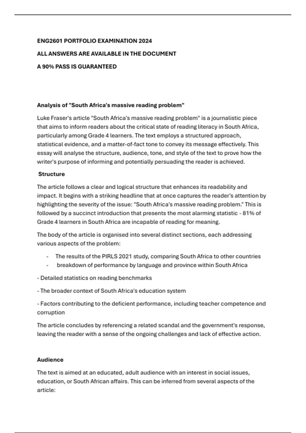 This document contains answers for ENG2601 PORTFOLIO EXAMINATION ANSWERS FOR THE ACADEMIC YEAR 2024. All ANSWERS ARE AVAILABLE IN THE DOCUMENT. All THE BEST AND GIVE US A REVIEW!!!!