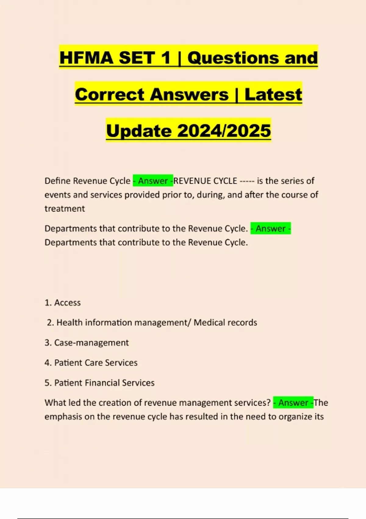 HFMA SET 1 | Questions and Correct Answers | Latest Update 2024/2025 Define Revenue Cycle - Answer -REVENUE CYCLE ----- is the series of events and services provided prior to, during, and after the course of treatment Departments that contribute to the Revenue Cycle. - Answer - Departments that contribute to the Revenue Cycle. 1. Access 2. Health information management/ Medical records 3. Case-management 4. Patient Care Services 5. Patient Financial Services What led the creation of revenue management services? - Answer -The emphasis on the revenue cycle has resulted in the need to organize itscomponents differently and created a new business unit known as revenue integrity or revenue management services. Benefit of Electronic transactions? - Answer -Electronic transactions."--- --- transactions are associated with revenue capture and collection activities. The implementation of electronic data interchange (EDI) allows actions previously conducted by telephone/ manual methods to be performed electronically ( improves wo