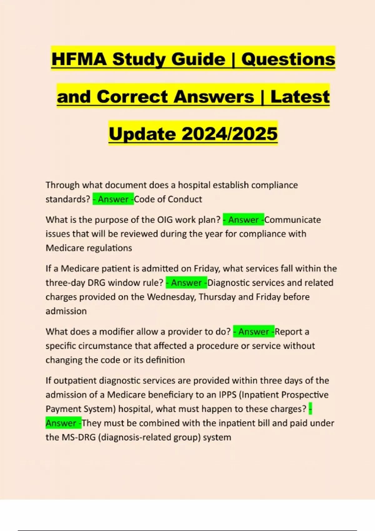 HFMA Study Guide | Questions and Correct Answers | Latest Update 2024/2025 Through what document does a hospital establish compliance standards? - Answer -Code of Conduct What is the purpose of the OIG work plan? - Answer -Communicate issues that will be reviewed during the year for compliance with Medicare regulations If a Medicare patient is admitted on Friday, what services fall within the three-day DRG window rule? - Answer -Diagnostic services and related charges provided on the Wednesday, Thursday and Friday before admission What does a modifier allow a provider to do? - Answer -Report a specific circumstance that affected a procedure or service without changing the code or its definition If outpatient diagnostic services are provided within t