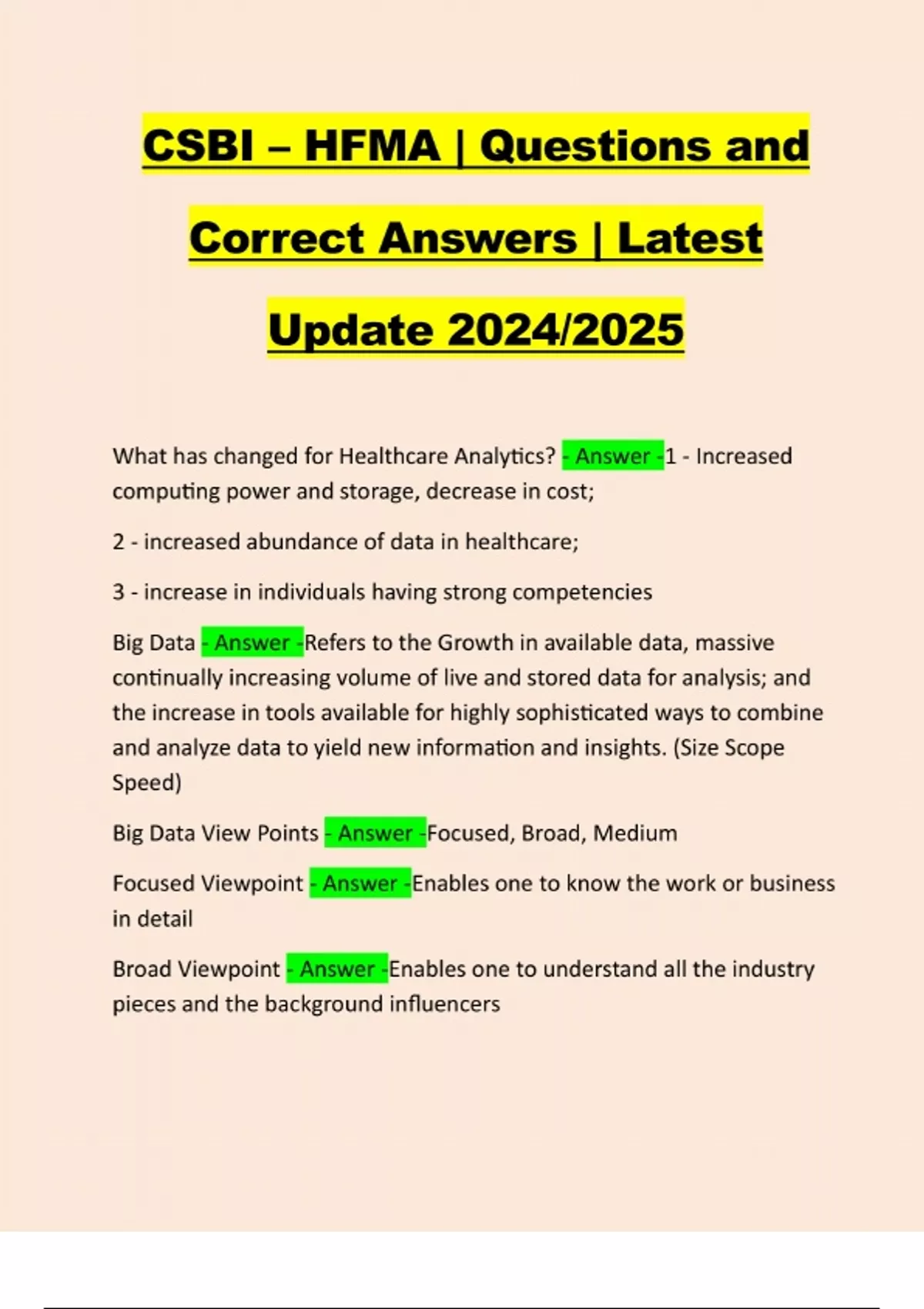 CSBI – HFMA | Questions and Correct Answers | Latest Update 2024/2025 What has changed for Healthcare Analytics? - Answer -1 - Increased computing power and storage, decrease in cost; 2 - increased abundance of data in healthcare; 3 - increase in individuals having strong competencies Big Data - Answer -Refers to the Growth in available data, massive continually increasing volume of live and stored data for analysis; and the increase in tools available for highly sophisticated ways to combine and analyze data to yield new information and insights. (Size Scope Speed) Big Data View Points - Answer -Focused, Broad, Medium Focused Viewpoint - Answer -Enables one to know the work or business in detail Broad Viewpoint - Answer -Enables one to understand all the industry pieces and the background influencersMedium Viewpoint - Answer -Enables one to know how one's business or work fits with the other pieces and how the other industry components fit and work with each other NKBDSI - Answer -Nursing Knowledge Big Data Science Initiative NKBDSI Organization - Answer -National organization committed to developing, implementing, and guiding a dynamic plan of action that ensures nursing data are captured and availabl