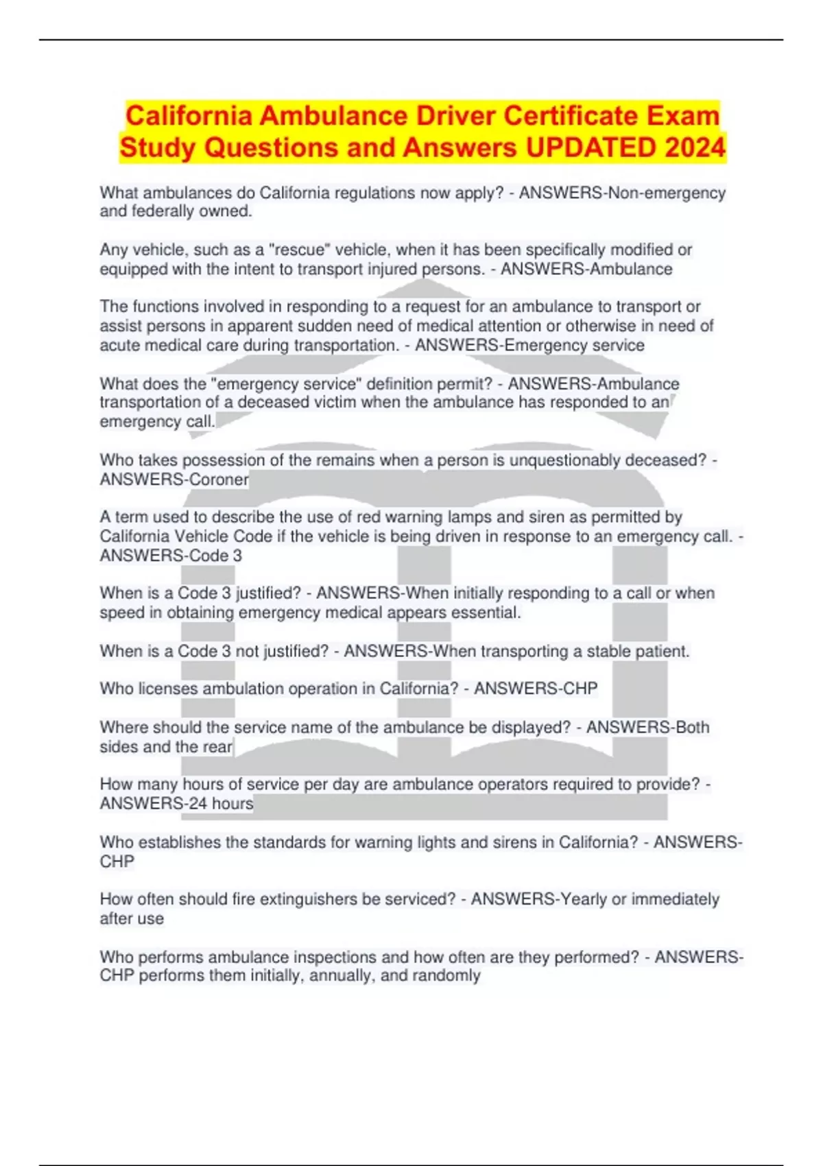 California Ambulance Driver Certificate Exam Study Questions and Answers UPDATED 2024