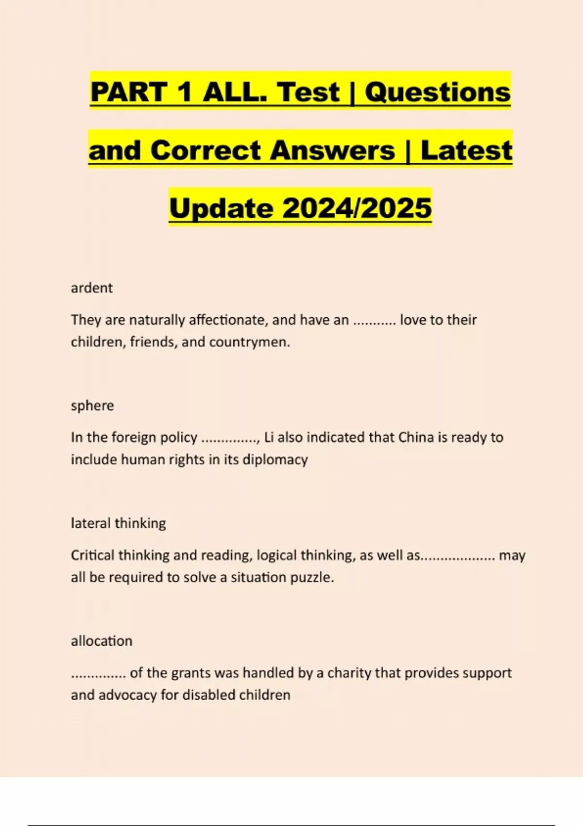 PART 1 ALL. Test | Questions and Correct Answers | Latest Update 2024/2025 ardent They are naturally affectionate, and have an ........... love to their children, friends, and countrymen. sphere In the foreign policy .............., Li also indicated that China is ready to include human rights in its diplomacy lateral thinking Critical thinking and reading, logical thinking, as well as................... may all be required to solve a situation puzzle. allocation .............. of the grants was handled by a charity that provides support and advocacy for disabled childrenconcede She ..................(-ed) defeat well before all the votes had been counted. en masse There is some evidence to suggest that older