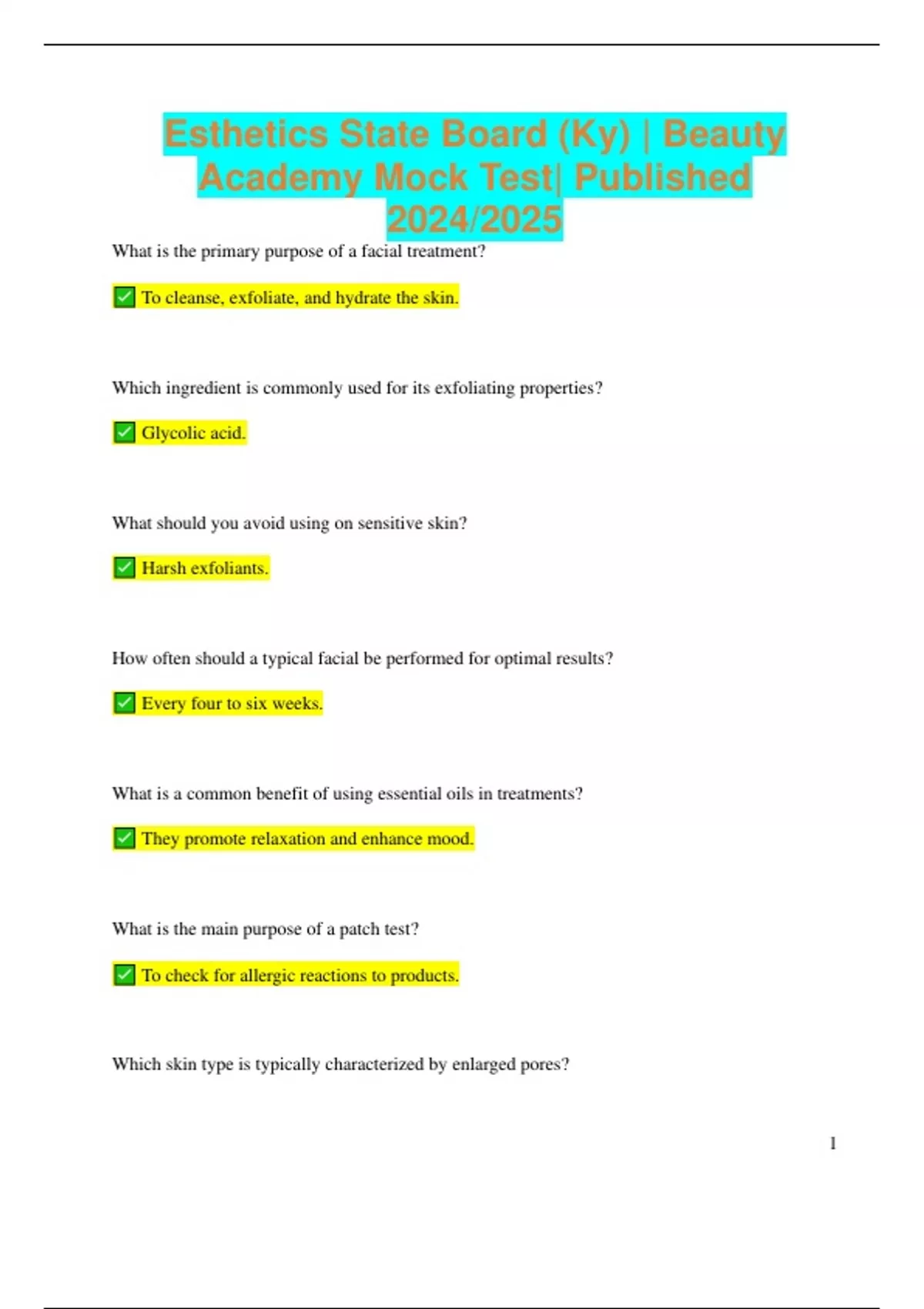 Esthetics State Board (Ky) | Beauty Academy Mock Test| Published 2024/2025 What is the primary purpose of a facial treatment? To cleanse, exfoliate, and hydrate the skin. Which ingredient is commonly used for its exfoliating properties? Glycolic acid. What should you avoid using on sensitive skin? Harsh exfoliants. How often should a typical facial be performed for optimal results? Every four to six weeks. What is a common benefit of using essential oils in treatments? They promote relaxation and enhance mood. What is the main purpose of a patch test? To check for allergic reactions to products. Which skin type is typically characterized by enlarged pores? 2 Oily skin. What is the primary function of sunscreen? To protect the skin from UV damage. Which type of mask is best for hydrating dry skin? Cream masks. How should you handle a client who is unhappy with their treatment? Listen actively and address their concerns professionally. What is the role of a toner in a skincare routine? To balance the skin’s pH and remove any leftover impurities. Which tool is often used for facial massage to enhance circulation? A jade roller. What is microdermabrasion primarily used for? To improve skin texture and reduce the appearance of fine lines. What is the benefit of incorporating antioxidants into skincare? They protect against environmental damage. 3 Which type of facial is best for acne-prone skin? A clarifying facial. How should you educate clients on proper home care? Provide personalized product recommendations based on their skin type. What is the purpose of steam in a facial treatment? To open up pores and prepare the skin for cleansing. Which ingredient is known for its anti-aging properties? Retinol. What should you consider when choosing products for a client? Their individual skin concerns and sensitivities. What is the effect of chemical peels on the skin? They promote skin renewal and improve texture. Which skin condition is characterized by redness and visible blood ves