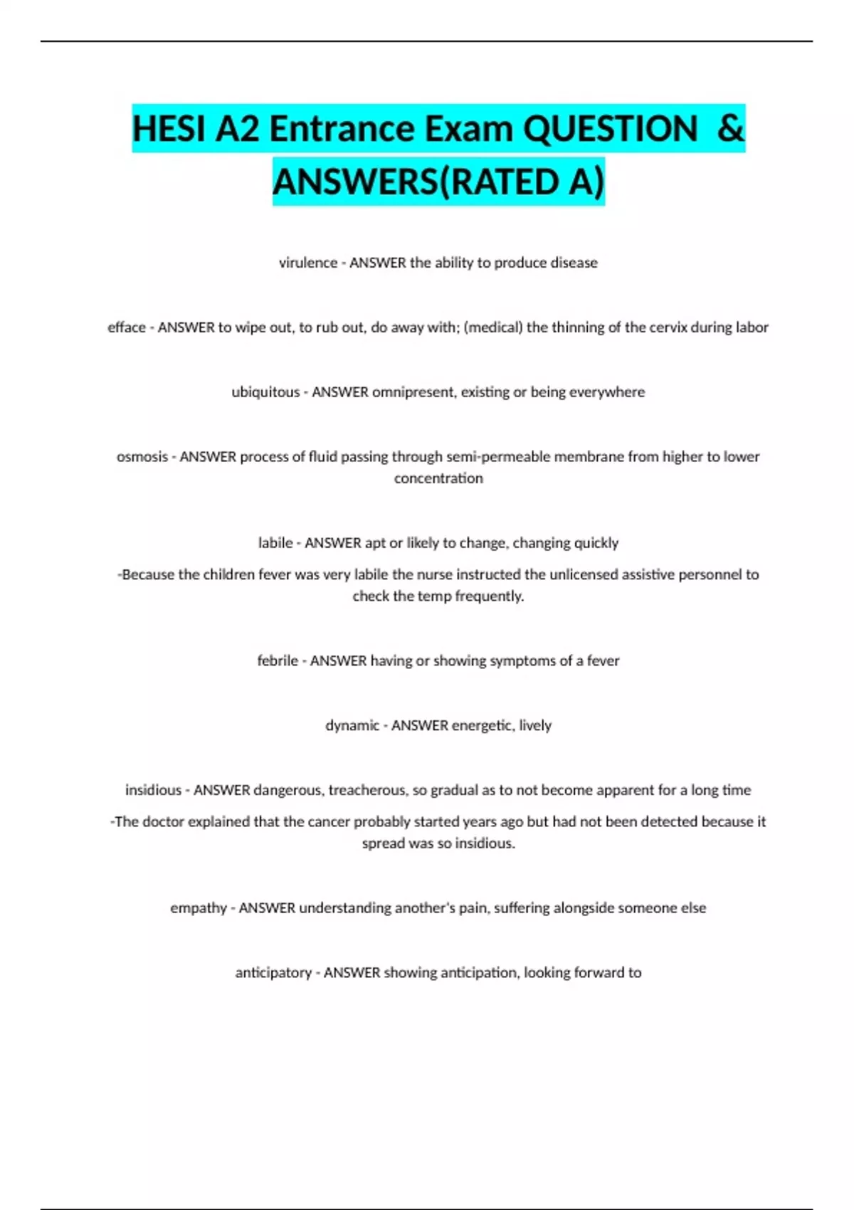 virulence - ANSWER the ability to produce disease efface - ANSWER to wipe out, to rub out, do away with; (medical) the thinning of the cervix during labor ubiquitous - ANSWER omnipresent, existing or being everywhere osmosis - ANSWER process of fluid passing through semi-permeable membrane from higher to lower concentration labile - ANSWER apt or likely to change, changing quickly -Because the children fever was very labile the nurse instructed the unlicensed assistive personnel to check the temp frequently.