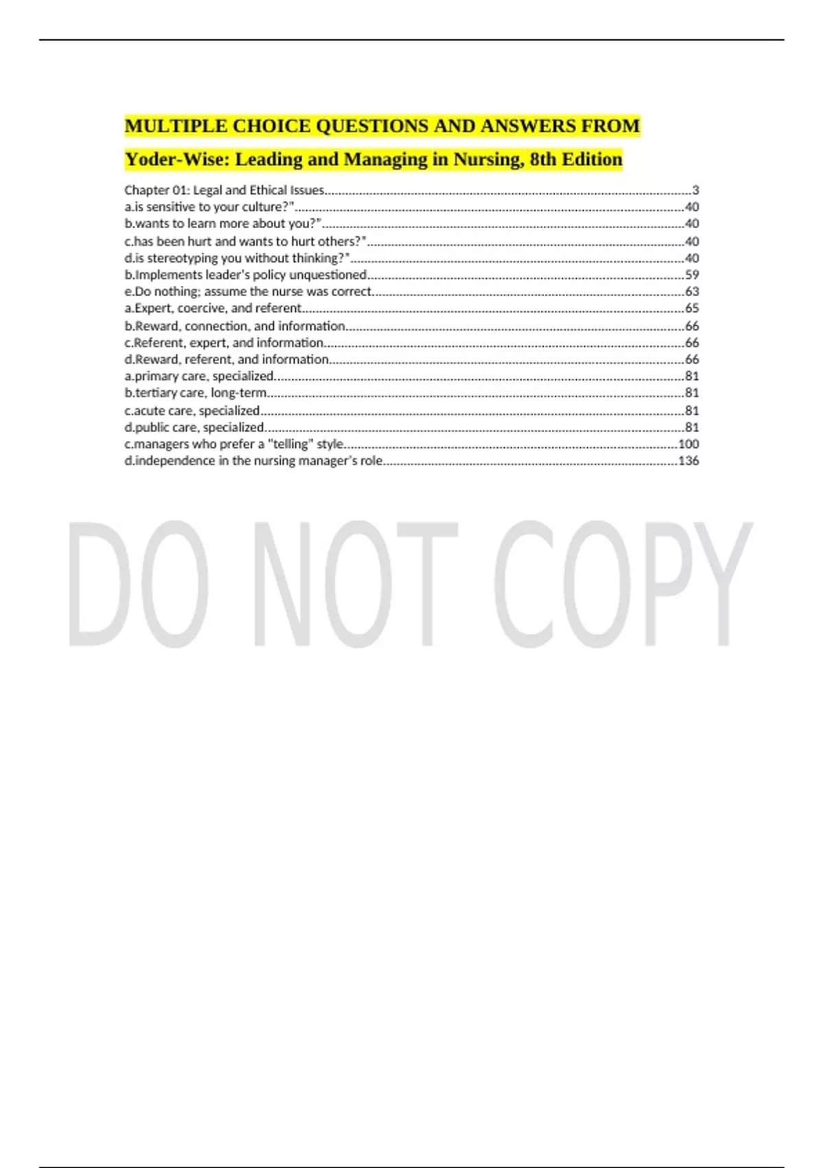 Test Bank For Leading and Managing in Nursing, 8th Edition by Patricia S. Yoder-Wise, Chapters multiple choice quiz with Answers and Rationals