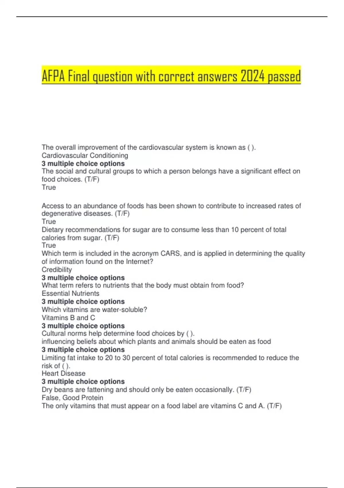 AFPA Final question with correct answers 2024 passed The overall improvement of the cardiovascular system is known as ( ). Cardiovascular Conditioning