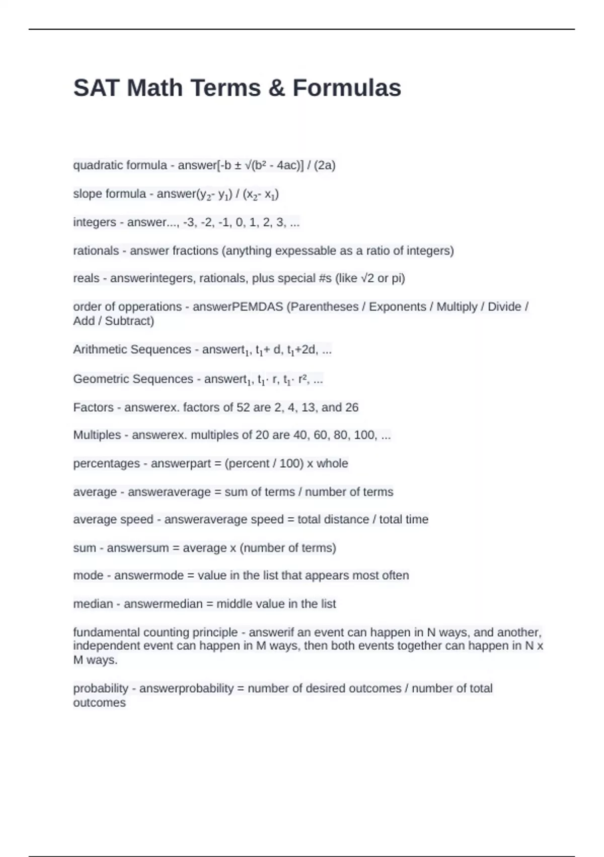 SAT Math Terms & Formulas