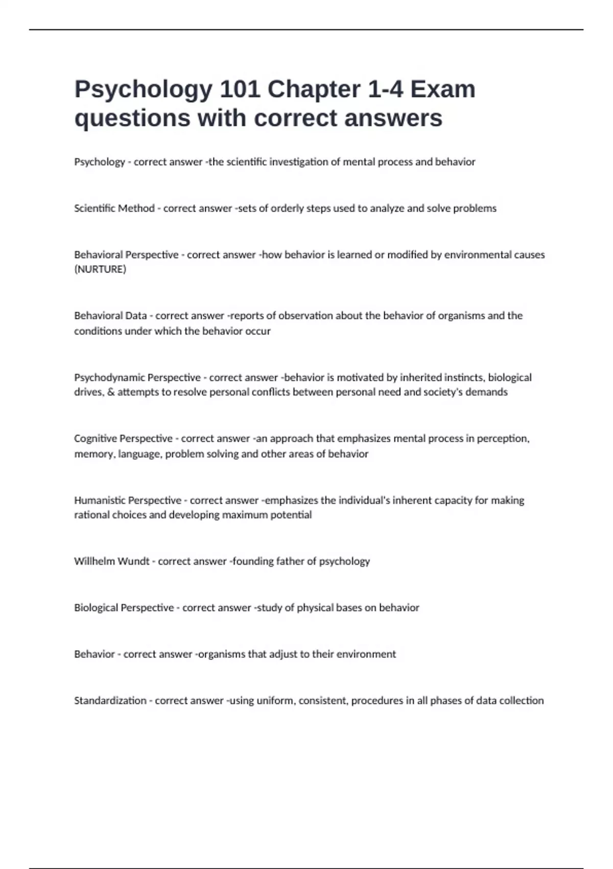 Psychology 101 Chapter 1-4 Exam questions with correct answers