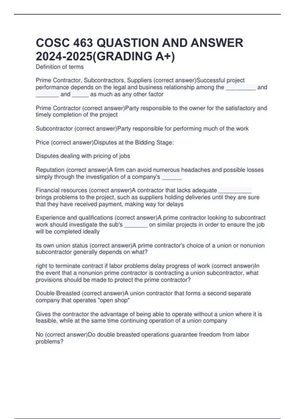 Prime Contractor (correct answer)Party responsible to the owner for the satisfactory and