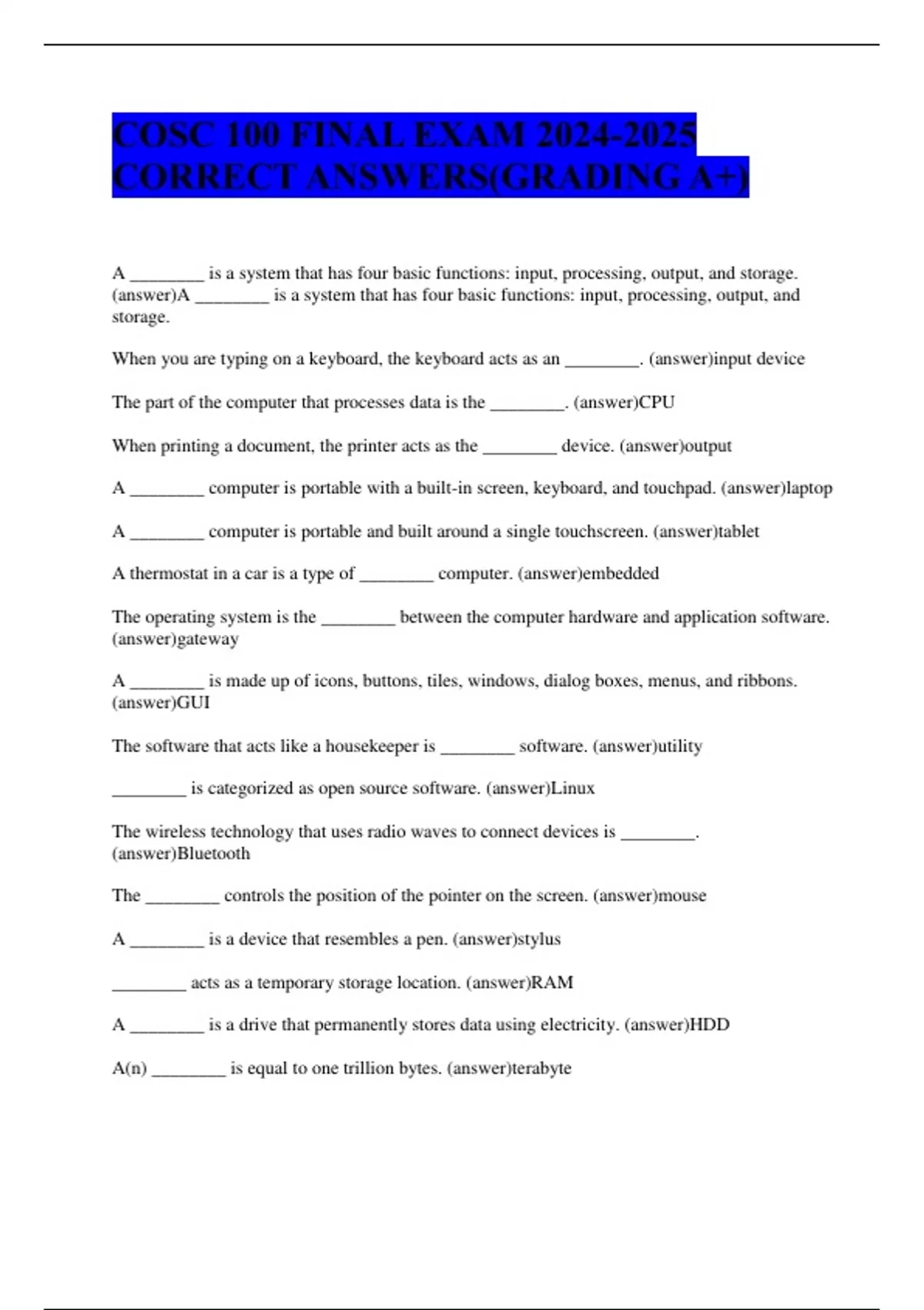 COSC 100 FINAL EXAM CORRECT ANSWERS(GRADING A+)