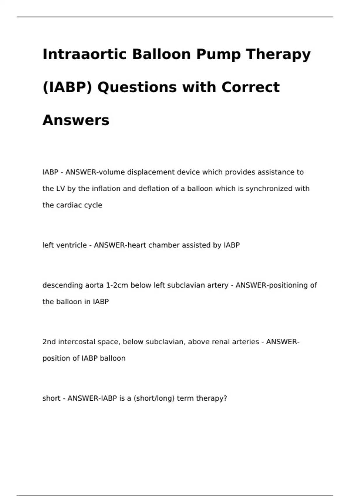 Intraaortic Balloon Pump Therapy (IABP) Questions with Correct AnswersIntraaortic Balloon Pump Therapy (IABP) Questions with Correct AnswersIntraaortic Balloon Pump Therapy (IABP) Questions with Correct AnswersIntraaortic Balloon Pump Therapy (IABP) Questions with Correct AnswersIntraaortic Balloon Pump Therapy (IABP) Questions with Correct AnswersIABP - ANSWER-volume displacement device which provides assistance to the LV by the inflation and deflation of a balloon which is synchronized with the cardiac cycle left ventricle - ANSWER-heart chamber assisted by IABP descending aorta 1-2cm below left subclavian artery - ANSWER-positioning of