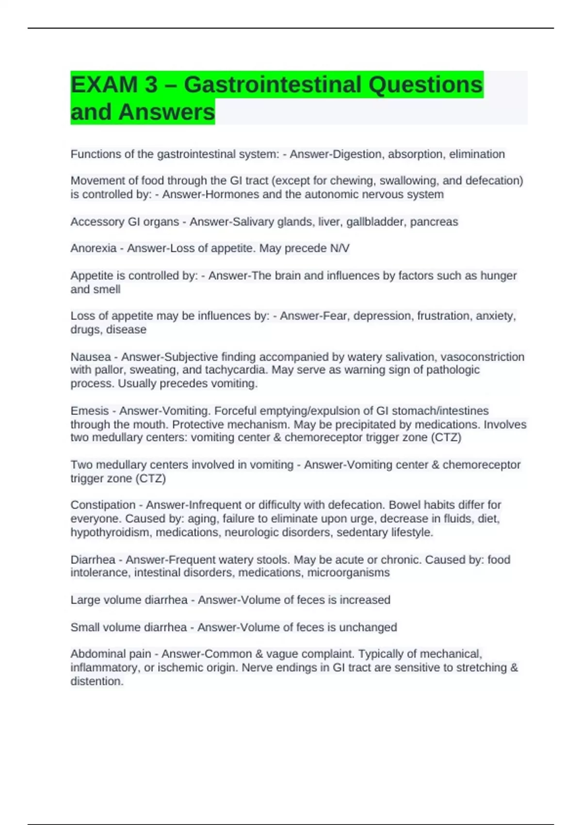 Functions of the gastrointestinal system: - Answer-Digestion, absorption, elimination