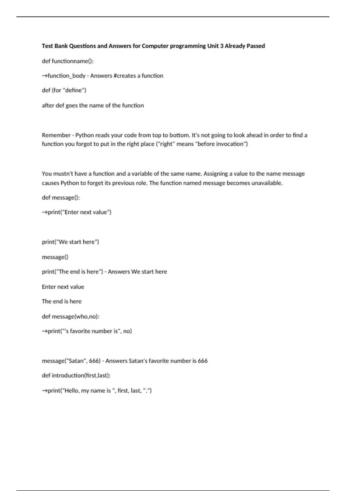 Test Bank Questions and Answers for Computer programming Unit 3 Already Passed def functionname(): →function_body - Answers #creates a function def (for "define") after def goes the name of the function Remember - Python reads your code from top to bottom. It's not going to look ahead in order to find a function you forgot to put in the right place ("right" means "before invocation") You mustn't have a function and a variable of the same name. Assigning a value to the name message causes Python to forget its previous role. The function named message becomes unavailable. def message(): →print("Enter next value") print("We start here") message() print("The end is here") - Answers We start here Enter next value The end is here def message(who,no): →print("'s favorite number is", no) message("Satan", 666) - Answers Satan's favorite number is 666 def introduction(first,last): →print("Hello, my name is ", first, last, ".") introduction(first="James", last="Bond") introduction(last="Skywalker", first="Luke") - Answers Hello, my name is James Bond. Hello, my name is Luke Skywalker. #You can mix both fashions if you want - there is only one unbreakable rule: you have to put positional arguments before keyword ones. def introduction(first, last="Adams"): →print("Hello, my name is ", first, last, ".") introduction("James") introduction("Hunter", "Skywalker") - Answers Hello, my name is James Adams . Hello, my name is Hunter Skywalker . def strange (n): →if(n % 2 == ): →→return True print(strange(2)) print(strange(1)) - Answers True None def sumoflist(l): →sum = 0 →for el in l: →→sum += el →return sum print(sumoflist([5,4,3])) - Answers 12