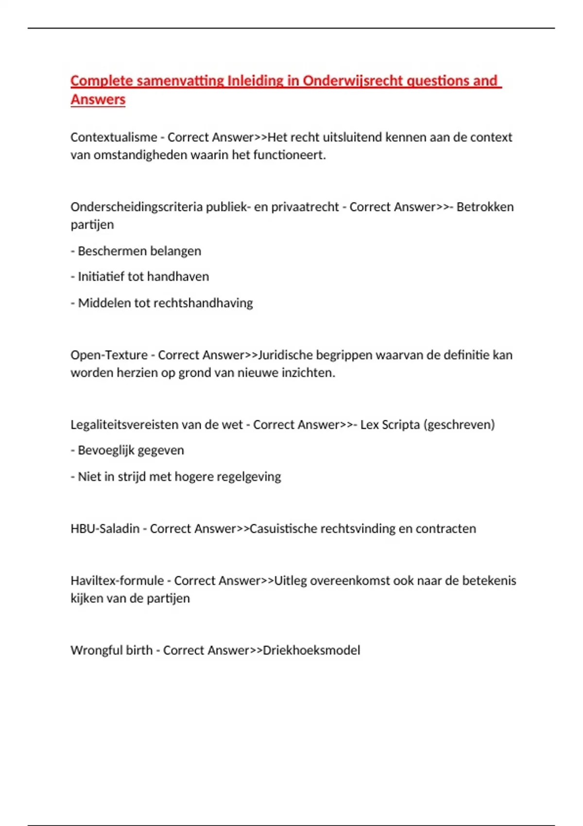 Complete samenvatting Inleiding in Onderwijsrecht questions and Answers Contextualisme - Correct Answer>>Het recht uitsluitend kennen aan de context van omstandigheden waarin het functioneert. Onderscheidingscriteria publiek- en privaatrecht - Correct Answer>>- Betrokken partijen - Beschermen belangen - Initiatief tot handhaven - Middelen tot rechtshandhaving Open-Texture - Correct Answer>>Juridische begrippen waarvan de definitie kan worden herzien op grond van nieuwe inzichten. Legaliteitsvereisten van de wet - Correct Answer>>- Lex Scripta (geschreven) - Bevoeglijk gegeven - Niet in strijd met hogere regelgeving HBU-Saladin - Correct Answer>>Casuistische rechtsvinding en contracten Haviltex-formule - Correct Answer>>Uitleg overeenkomst ook naar de betekenis kijken van de partijen Wrongful birth - Correct Answer>>Driekhoeksmodel Traditionele opvatting - Correct Answer>>Formele eenheid, hoogste regel geldt Moderne opvatting - Correct Answer>>Materiële eenheid, interpretatie en regels afstemmen Legaliteit - Correct Answer>>Gelding Legitimiteit - Correct Answer>>Is de bron acceptabel voor ons? Codificatie - Correct Answer>>Geschreven recht Rechtshandeling - Correct Answer>>BEWUSt rechtsgevolg voor ogen Feitelijke handeling - Correct Answer>>ONBEWUSTE handeling Ongeschreven recht - Correct Answer>>Gebaseerd op normen en waarden. Gewoonterecht en rechtsbeginselen Geldingsvoorwaarde gewoonterecht - Correct Answer>>- Usus: herhaling van feiten - Opinio Necessitaris: het recht vereist op een bepaalde manier gedaan te worden en niet anders Rechtsbeginselen zijn - Correct Answer>>- Fundamentele opvattingen