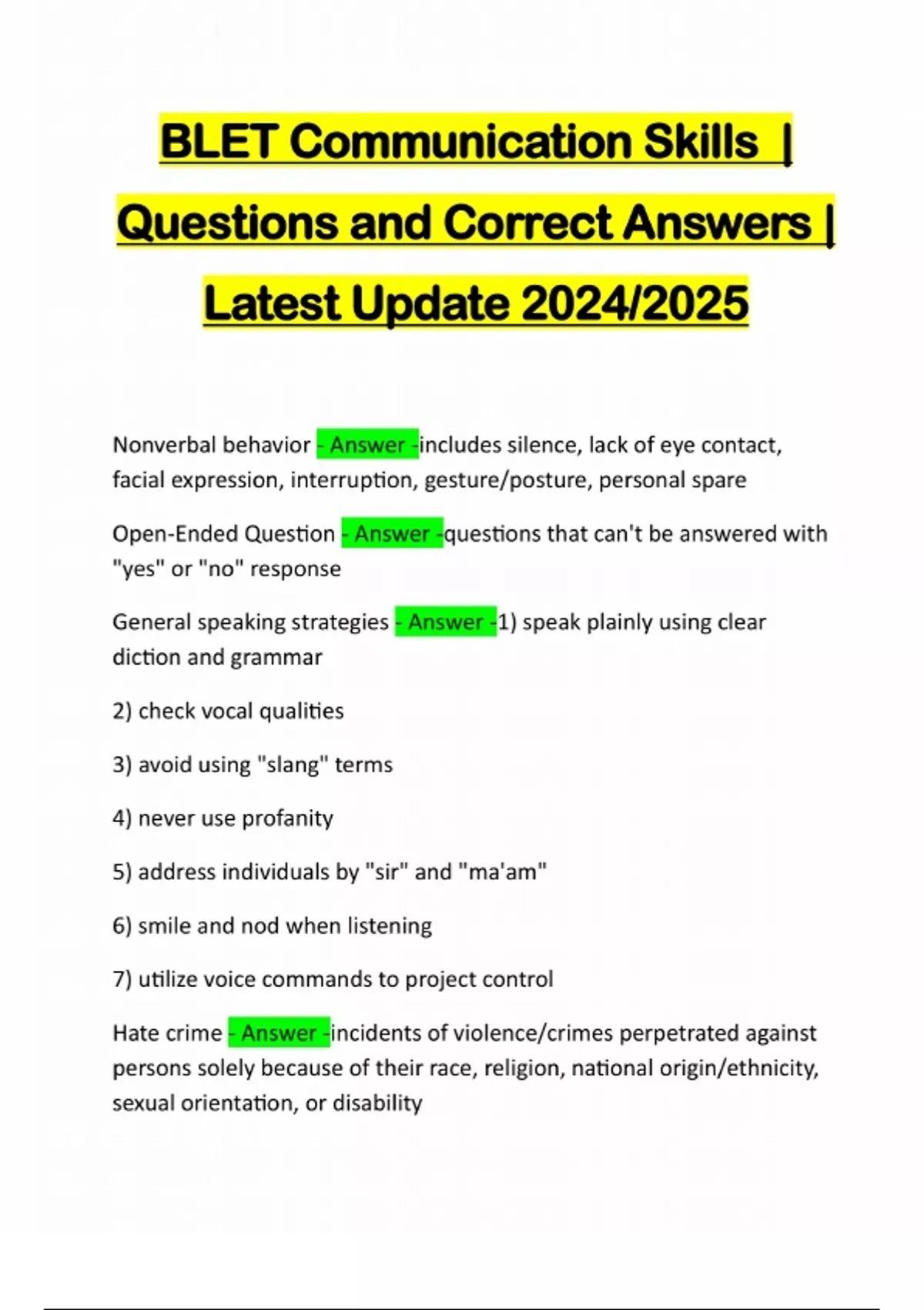 BLET Communication Skills | Questions and Correct Answers | Latest Update 2024/2025 Nonverbal behavior - Answer -includes silence, lack of eye contact, facial expression, interruption, gesture/posture, personal spare Open-Ended Question - Answer -questions that can't be answered with "yes" or "no" response General speaking strategies - Answer -1) speak plainly using clear diction and grammar 2) check vocal qualities 3) avoid using "slang" terms 4) never use profanity 5) address individuals by "sir" and "ma'am" 6) smile and nod when listening