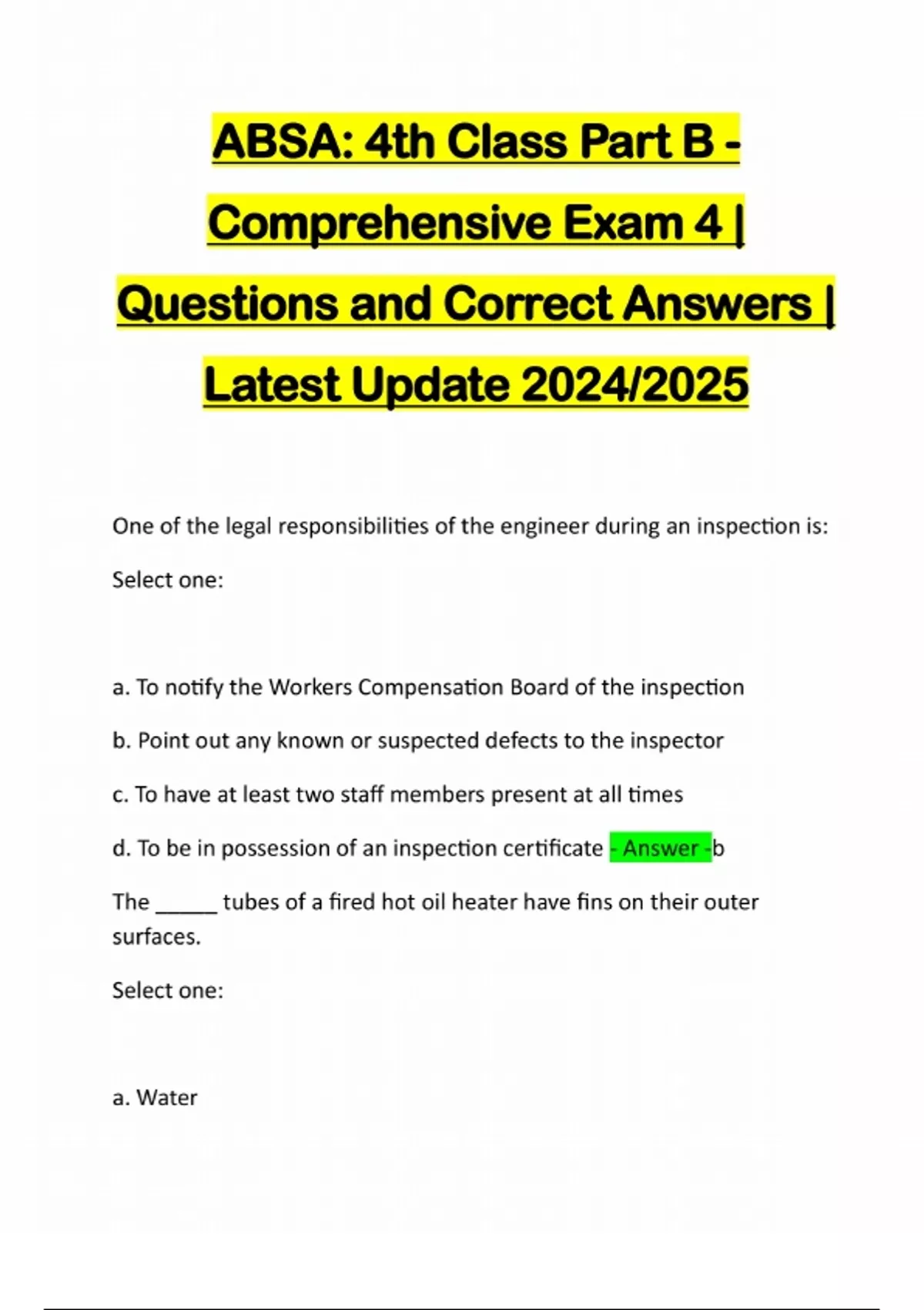 ABSA: 4th Class Part B - Comprehensive Exam 4 | Questions and Correct Answers | Latest Update 2024/2025 One of the legal responsibilities of the engineer during an inspection is: Select one: a. To notify the Workers Compensation Board of the inspection b. Point out any known or suspected defects to the inspector c. To have at least two staff members present at all times d. To be in possession of an inspection certificate - Answer -b The _____ tubes of a fired hot oil heater have fins on their outer surfaces. Select one: a. Waterb. Radiant c. Extended type d. Fire - Answer -c The injection pump of a diesel engine is driven by: Select one: a. A camshaft b. The governor