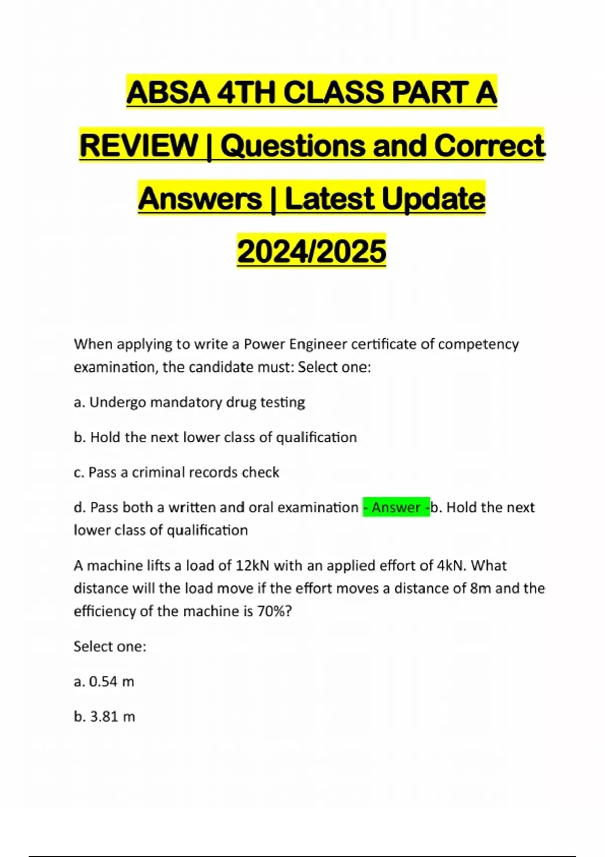 ABSA 4TH CLASS PART A REVIEW | Questions and Correct Answers | Latest Update 2024/2025 When applying to write a Power Engineer certificate of competency examination, the candidate must: Select one: a. Undergo mandatory drug testing b. Hold the next lower class of qualification c. Pass a criminal records check d. Pass both a written and oral examination - Answer -b. Hold the next lower class of qualification A machine lifts a load of 12kN with an applied effort of 4kN. What distance will the load move if the effort moves a distance of 8m and the efficiency of the machine is 70%? Select one: a. 0.54 m b. 3.81 mc. 1.87 m d. 0.38 m - Answer -c. 1.87 m Which of these is the "Mechanical Refrigeration Code"? Select one: a. ASME MRC b. CSA B51. c. CSA B52. d. ASME Section I. - Answer -c. CSA B52. In order to ensure safe and continuous operation of a pressure reduc