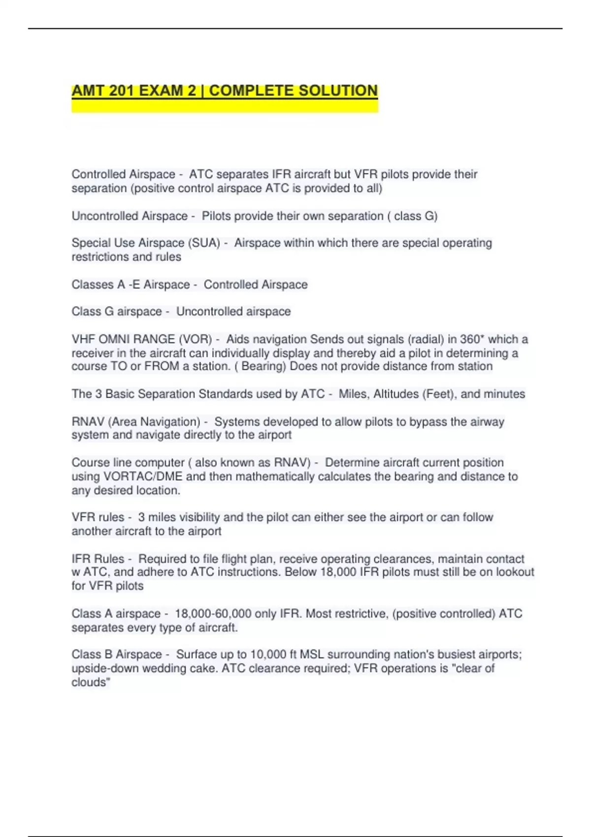 AMT 201 EXAM 2 | COMPLETE SOLUTION Controlled Airspace - ATC separates IFR aircraft but VFR pilots provide their separation (positive control airspace ATC is provided to all) Uncontrolled Airspace - Pilots provide their own separation ( class G) Special Use Airspace (SUA) - Airspace within which there are special operating restrictions and rules Classes A -E Airspace - Controlled Airspace Class G airspace - Uncontrolled airspace VHF OMNI RANGE (VOR) - Aids navigation Sends out signals (radial) in 360* which a receiver in the aircraft can individually display and thereby aid a pilot in determining a course TO or FROM a station. ( Bearing) Does not provide distance from station The 3 Basic Separation Standards used by ATC - Miles, Altitudes (Feet), and minutes RNAV (Area Navigation) - Systems developed to allow pilots to bypass the airway system and navigate directly to the airport Course line computer ( also known as RNAV) - Determine aircraft current position using VORTAC/DME and then mathematically calculates the bearing and distance to any desired location.