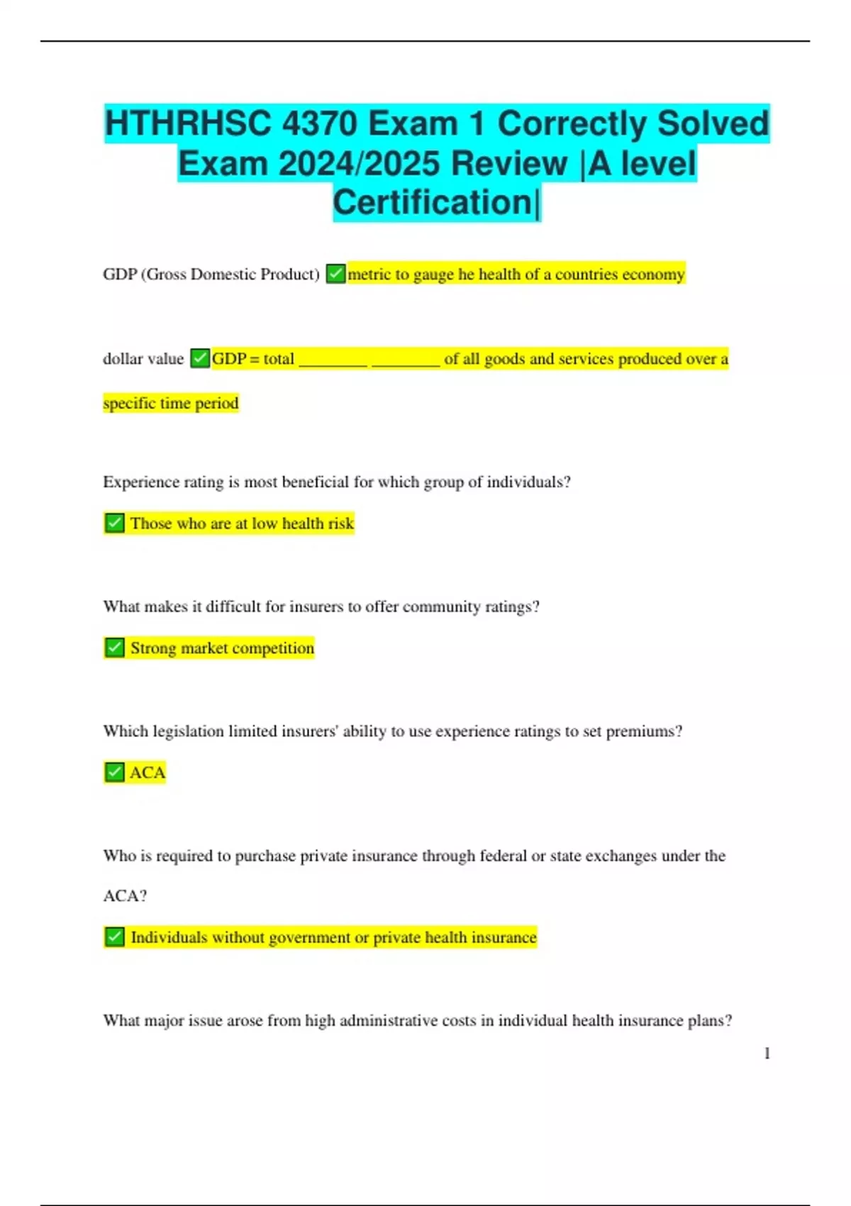 HTHRHSC 4370 Exam 1 Correctly Solved Exam 2024/2025 Review |A level Certification| GDP (Gross Domestic Product) metric to gauge he health of a countries economy dollar value GDP = total ________ ________ of all goods and services produced over a specific time period Experience rating is most beneficial for which group of individuals? Those who are at low health risk What makes it difficult for insurers to offer community ratings? Strong market competition Which legislation limited insurers' ability to use experience ratings to set premiums? ACA Who is required to purchase private insurance through federal or state exchanges under the ACA? Individuals without government or private health insurance What major issue arose from high administrative costs in individual health insurance plans? 2 High costs for individuals When did employment-based private insurance grow in popularity? During wage and price controls, when wage increases were limited Which two groups received little benefit from the expansion of private insurance? The poor and elderly Medicare Part A primarily covers what type of services? Hospital services How is Medicare Part B funded? Federal taxes and monthly premiums What does Medicare Part D provide coverage for? Prescription drugs What are Medicaid services financed by? Federal and state taxes What is the purpose of Medicare Part C? Medicare Advantage, offering supplemental coverage 3 What percentage of Medicare beneficiaries spend more than 20% of their income on medical care? 15% What is Medicaid's role in health coverage? It insures 1 in 6 people and is the largest health program for the poor What is the minimum percentage of Medicaid funding provided by the federal government? 50% Who qualifies for Medicaid in non-expansion states?