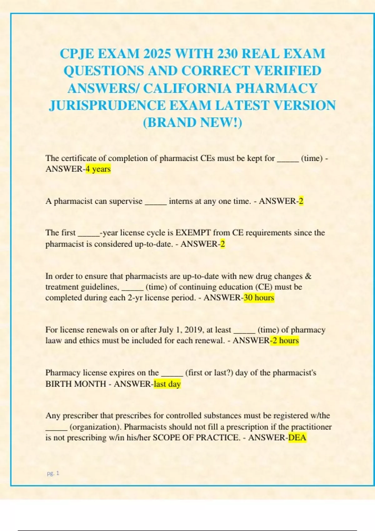 CPJE EXAM 2025 WITH 230 REAL EXAM QUESTIONS AND CORRECT VERIFIED ANSWERS/ CALIFORNIA PHARMACY JURISPRUDENCE EXAM LATEST VERSION (BRAND NEW!)