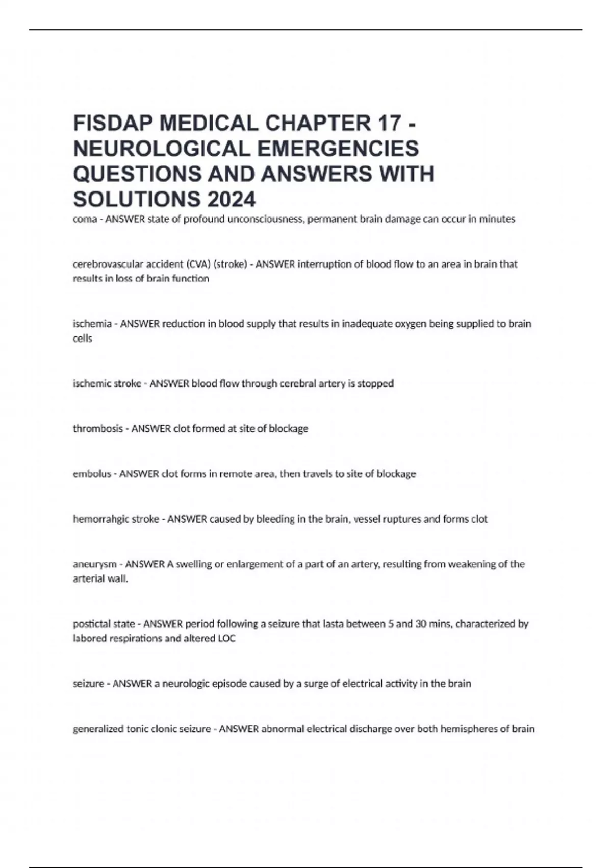 FISDAP MEDICAL CHAPTER 17 - NEUROLOGICAL EMERGENCIES QUESTIONS AND ANSWERS WITH SOLUTIONS 2024