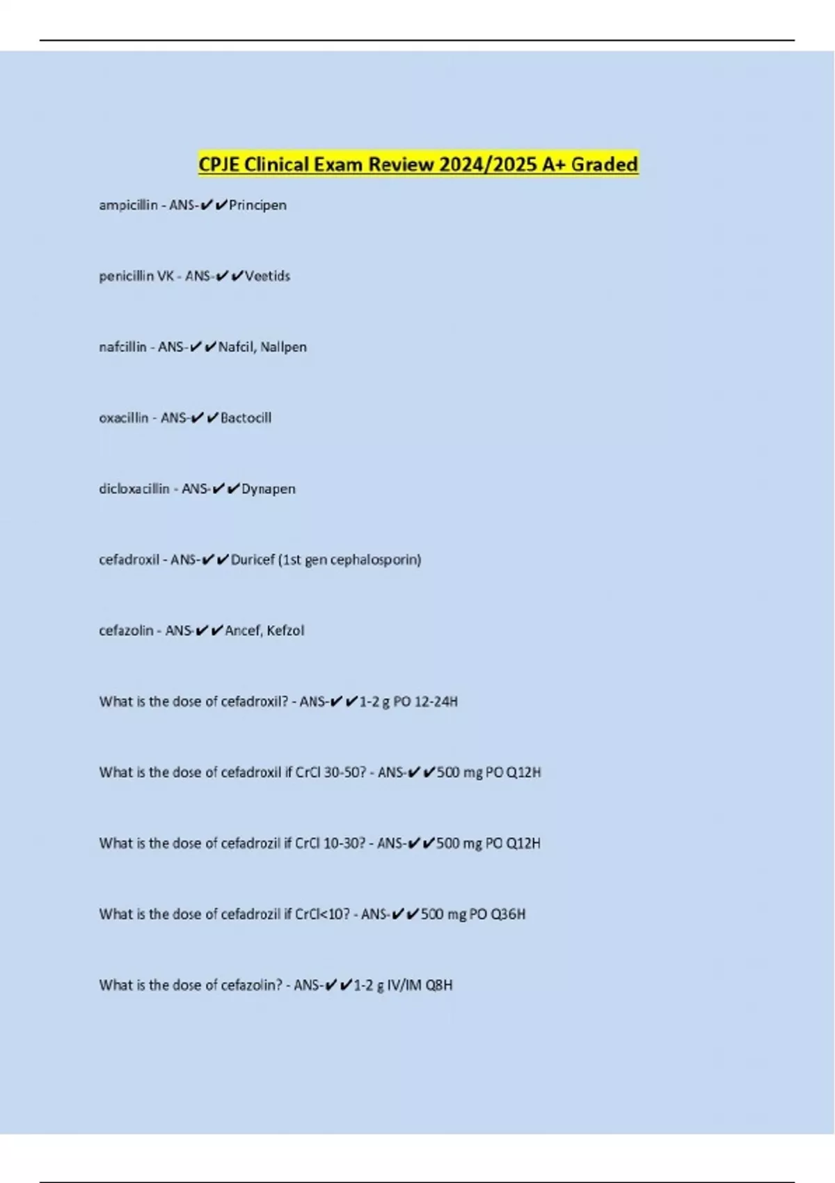 CPJE Clinical Exam Review 2024/2025 A+ Graded ampicillin - ANS-Principen penicillin VK - ANS-Veetids nafcillin - ANS-Nafcil, Nallpen oxacillin - ANS-Bactocill dicloxacillin - ANS-Dynapen cefadroxil - ANS-Duricef (1st gen cephalosporin) cefazolin - ANS-Ancef, Kefzol What is the dose of cefadroxil? - ANS-1-2 g PO 12-24H What is the dose of cefadroxil if CrCl 30-50? - ANS-500 mg PO Q12H What is the dose of cefadrozil if CrCl 10-30? - ANS-500 mg PO Q12H What is the dose of cefadrozil if CrCl<10? - ANS-500 mg PO Q36H What is the dose of cefazolin? - ANS-...