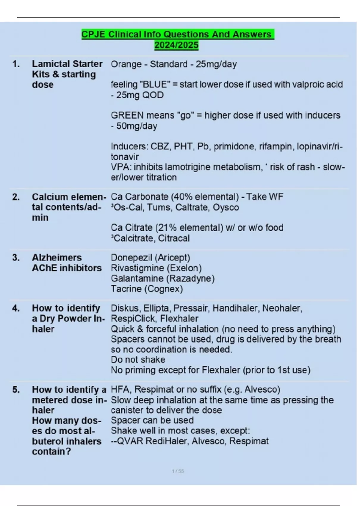 CPJE Clinical Info Questions And Answers 2024/2025 Lamictal Starter Kits & starting dose Orange - Standard - 25mg/day feeling "BLUE" = start lower dose if used with valproic acid - 25mg QOD GREEN means "go" = higher dose if used with inducers - 50mg/day Inducers: CBZ, PHT, Pb, primidone, rifampin, lopinavir/ri- tonavir VPA: inhibits lamotrigine metabolism, ‘ risk of rash - slow- er/lower titration 2. Calcium elemen- tal contents/ad- min Ca Carbonate (40% elemental) - Take WF ³Os-Cal, Tums, Caltrate, Oysco Ca Citrate (21% elemental) w/ or w/o food ³Calcitrate, Citracal 3. Alzheimers AChE inhibitors Donepezil (Aricept) Rivastigmine (Exelon) Galantamine (Razadyne) Tacrine (Cognex) 4. How to identify a Dry Powder In- haler Diskus, Ellipta, Pressair, Handihaler, Neohaler, RespiClick, Flexhaler Quick & forceful inhalation (no need to press anything) Spacers cannot be used, drug is delivered by the breath so no coordination is needed. Do not shake No priming except for Flexhaler (prior to 1st use) 5. How to identify a metered dose in- haler How many dos- es do most al- buterol inhalers contain?... Continues....