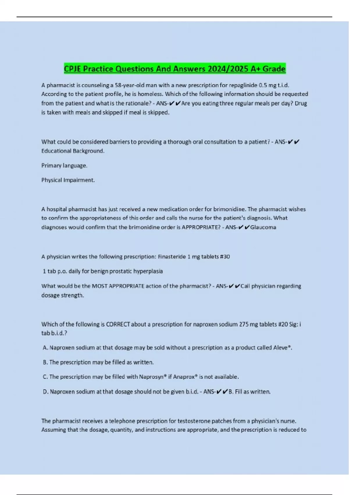 CPJE Practice Questions And Answers 2024/2025 A+ Grade A pharmacist is counseling a 58-year-old man with a new prescription for repaglinide 0.5 mg t.i.d. According to the patient profile, he is homeless. Which of the following information should be requested from the patient and what is the rationale? - ANS-Are you eating three regular meals per day? Drug is taken with meals and skipped if meal is skipped. What could be considered barriers to providing a thorough oral consultation to a patient? - ANS- Educational Background. Primary language. Physical Impairment. A hospital pharmacist has just received a new medication order for brimonidine. The pharmacist wishes to confirm the appropriateness of this order and calls the nurse for the patient's diagnosis. What diagnoses would confirm that the brimonidine order is APPROPRIATE? - ANS-Glaucoma A physician writes the following prescription: Finasteride 1 mg tablets #30 1 tab p.o. daily for benign prostatic hyperplasia What would be the MOST APPROPRIATE action of the pharmacist? - ANS-Call physician regarding dosage strength. Which of the following is CORRECT about a prescription for naproxen sodium 275 mg tablets #20 Sig: i tab b.i.d.? A. Naproxen sodium at that dosage may be sold without a prescription as a product called Aleve®. B. The prescription may be filled as written. C. The prescription may be filled with Naprosyn® if Anaprox® is not available. D. Naproxen sodium at that dosage should not be given b.i.d. - ANS-B. Fill as written. The pharmacist receives a telephone prescription for testosterone patches from a physician's nurse. Assuming that the dosage, quantity, and instructions are appropriate, and the prescription is reduced to Continues...