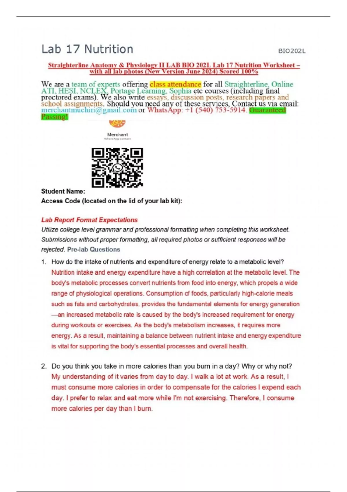 Straighterline Anatomy & Physiology II LAB BIO 202L Lab 17 Nutrition Worksheet – with all lab photos (New Version June 2024) Scored 100%