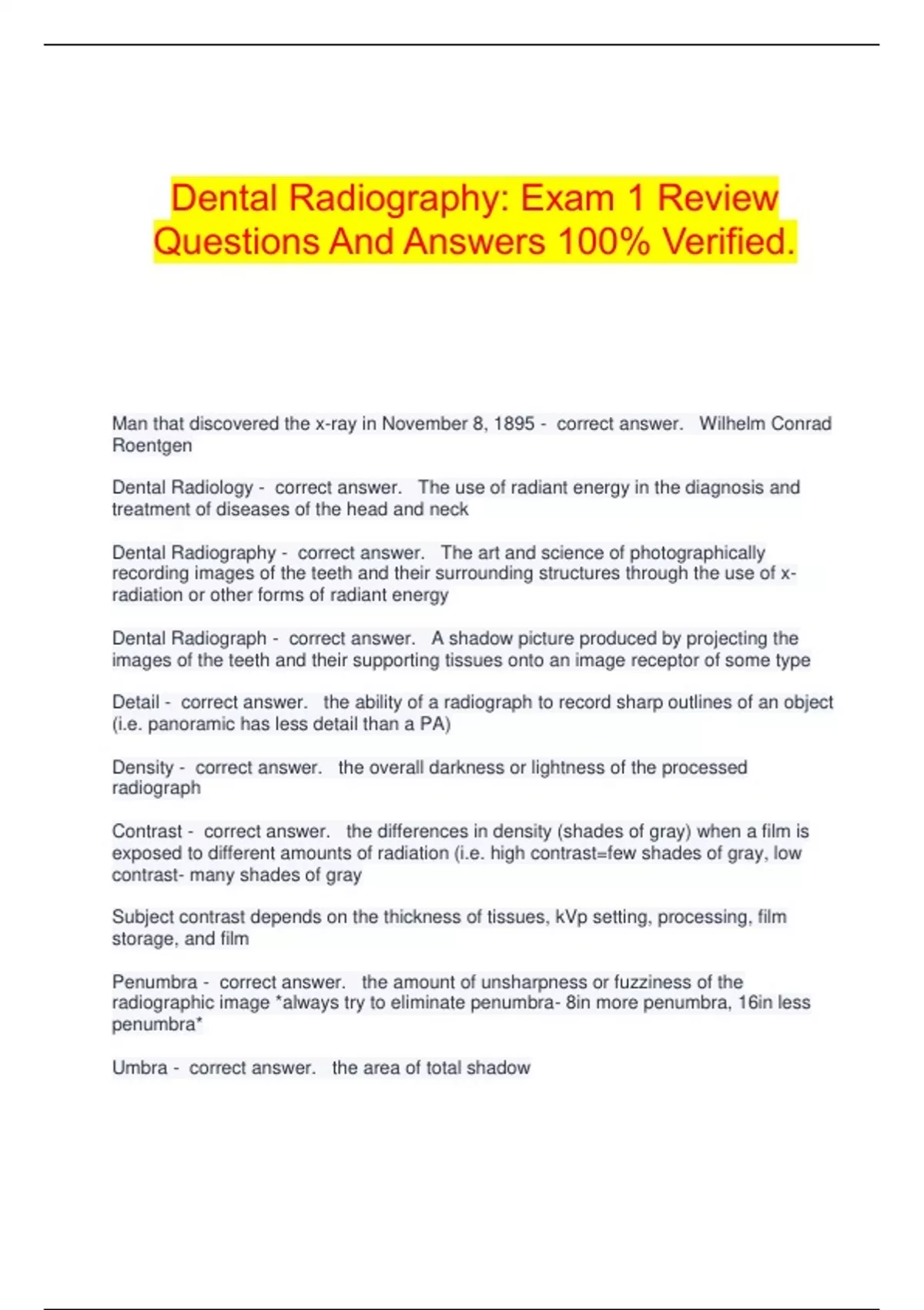 Dental Radiography: Exam 1 Review Questions And Answers 100% Verified. Man that discovered the x-ray in November 8, 1895 - correct answer. Wilhelm Conrad Roentgen Dental Radiology - correct answer. The use of radiant energy in the diagnosis and treatment of diseases of the head and neck Dental Radiography - correct answer. The art and science of photographically recording images of the teeth and their surrounding structures through the use of x-radiation or other forms of radiant energy Dental Radiograph - correct answer. A shadow picture produced by projecting the images of the teeth and their supporting tissues onto an image receptor of some type Detail - correct answer. the ability of a radiograph to record sharp outlines of an object (i.e. panoramic has less detail than a PA) Density - correct answer. the overall darkness or lightness of the processed radiograph Contrast - correct answer. the differences in density (shades of gray) when a film is exposed to different amounts of radiation (i.e. high contrast=few shades of gray, low contrast- many shades of gray Subject contrast depends on the thickness of tissues, kVp setting, processing, film storage, and film Penumbra - correct answer. the amount of unsharpness or fuzziness of the radiographic image *always try to eliminate penumbra- 8in more penumbra, 16in less penumbra* Umbra - correct answer. the area of total shadow Latent Image - correct answer. pattern formed by the interaction of x-rays or light with the silver halide crystals in the emulsion Intraoral - correct answer. involves a receptor IN the mouth (i.e. bitewings) Extraoral - correct answer. involves a receptor OUTSIDE the mouth (i.e. panoramic) Purpose of Radiographs - correct answer. • To detect lesions, diseases, and conditions of the teeth and surrounding structures that cannot be identified clinically • To confirm or classify suspected disease • To localize lesions or foreign objects • To provide information during dental procedures (e.g., root canal therapy, placement of dental implants) • To evaluate growth and development • To illustrate changes secondary to caries, periodontal disease, and trauma • To document the condition of a patient at a specific point in time • To aid in development of a clinical treatment plan 3 Types of examinations use Intraoral Radiographs - correct answer. Periapical, Interproximal, Occlusal exams Periapical Examination - correct answer. Examines the entire tooth (crown, root, and supporting bone) Receptor: PA receptor Technique used: Parallel or Bisecting Interproximal Examination - correct answer. Examines the crowns of maxillary and mandibular teeth. Receptor: BWX receptor Technique used: BWX technique Occlusal Examination - correct answer. Examines large areas of the maxilla or the mandible in one image Receptor: Occlusal receptor Technique: Occlusal technique Full Mouth Series (FMX) - correct answer. Series of radiographs that show all the tooth bearing areas of both jaws (14-20 images) 3 Qualities of a Diagnostic Radiograph - correct answer. Sharpness, Shape, and Size Rules of Shadow Casting - correct answer. 1. Source of radiation as small as possible 2. Source to object distance as long as practical (16inches recommended) 3. Object to film distance as short as possible 4. Object and film parallel 5. Source perpendicular to object and film
