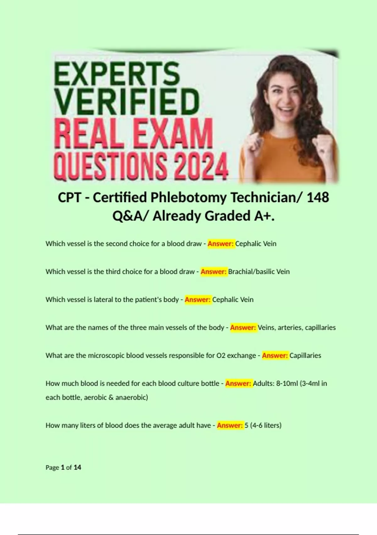 CPT - Certified Phlebotomy Technician/ 148 Q&A/ Already Graded A+. Terms like: Which vessel is the second choice for a blood draw - Answer: Cephalic Vein Which vessel is the third choice for a blood draw - Answer: Brachial/basilic Vein Which vessel is lateral to the patient's body - Answer: Cephalic Vein What are the names of the three main vessels of the body - Answer: Veins, arteries, capillaries