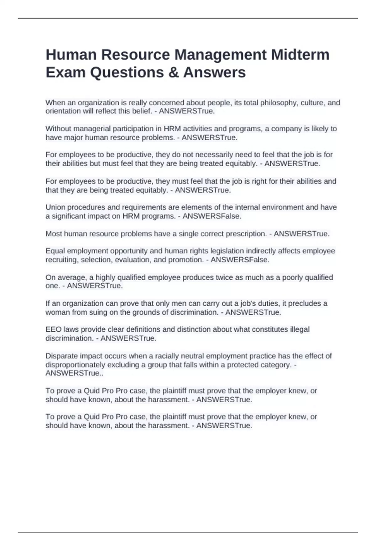 When an organization is really concerned about people, its total philosophy, culture, and orientation will reflect this belief. - ANSWERSTrue. Without managerial participation in HRM activities and programs, a company is likely to have major human resource problems. - ANSWERSTrue. For employees to be productive, they do not necessarily need to feel that the job is for their abilities but must feel that they are being treated equitably. - ANSWERSTrue. For employees to be productive, they must feel that the job is right for their abilities and that they are being treated equitably. - ANSWERSTrue. Union procedures and requirements are elements of the internal environment and have a significant impact on HRM programs. - ANSWERSFalse. Most human resource problems have a single correct prescription. - ANSWERSTrue. Equal employment opportunity and human rights legislation indirectly affects employee recruiting, selection, evaluation, and promotion. - ANSWERSFalse. On average, a highly qualified employee produces twice as much as a poorly qualified one. - ANSWERSTrue. If an organization can prove that only men can carry out a job's duties, it precludes a woman from suing on the grounds of discrimination. - ANSWERSTrue. EEO laws provide clear definitions and distinction about what constitutes illegal discrimination. - ANSWERSTrue. Disparate impact occurs when a racially neutral employment practice has the effect of disproportionately excluding a group that falls within a protected category. - ANSWERSTrue.. To prove a Quid Pro Pro case, the plaintiff must prove that the employer knew, or should have known, about the harassment. - ANSWERSTrue. To prove a Quid Pro Pro case, the plaintiff must prove that the employer knew, or should have known, about the harassment. - ANSWERSTrue.