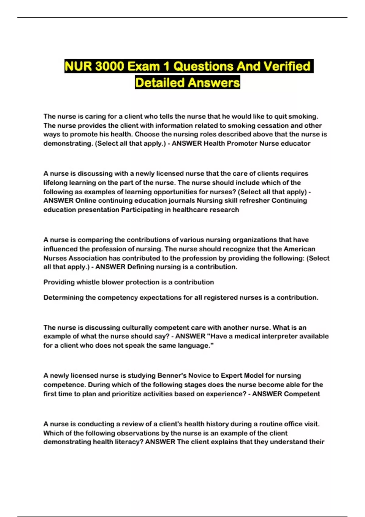 NUR 3000 Exam 1 Questions And Verified Detailed Answers