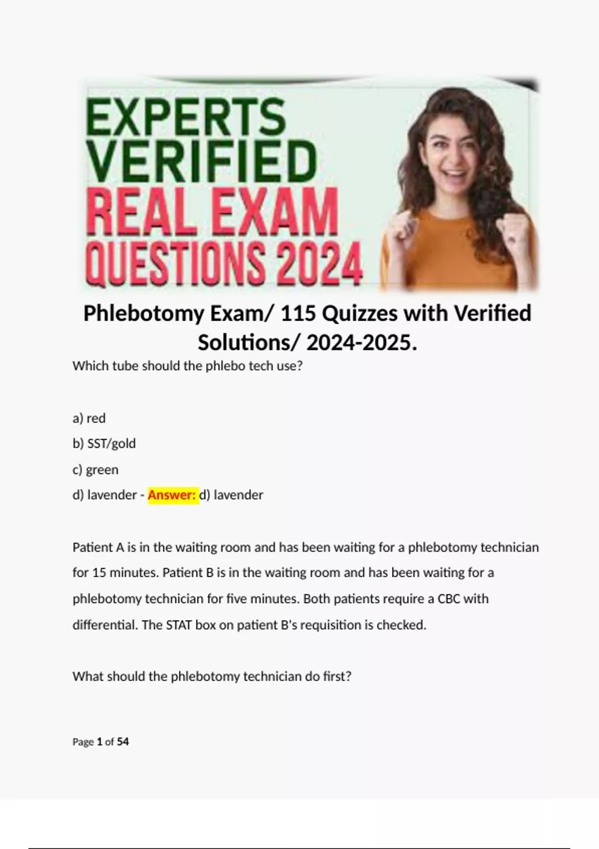Phlebotomy Exam/ 115 Quizzes with Verified Solutions/ . Which tube should the phlebo tech use? Terms like: a) red b) SST/gold c) green d) lavender - Answer: d) lavender Patient A is in the waiting room and has been waiting for a phlebotomy technician for 15 minutes. Patient B is in the waiting room and has been waiting for a phlebotomy technician for five minutes. Both patients require a CBC with differential. The STAT box on patient B's requisition is checked.