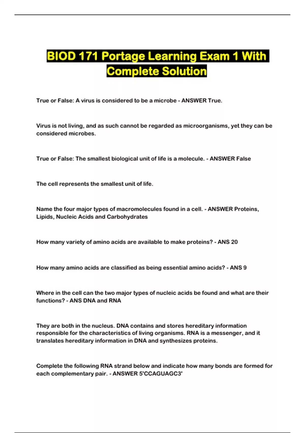 BIOD 171 Portage Learning Exam 1 With Complete Solution...