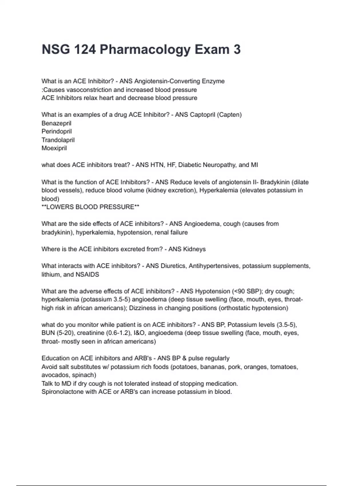 blood vessels), reduce blood volume (kidney excretion), Hyperkalemia (elevates potassium in